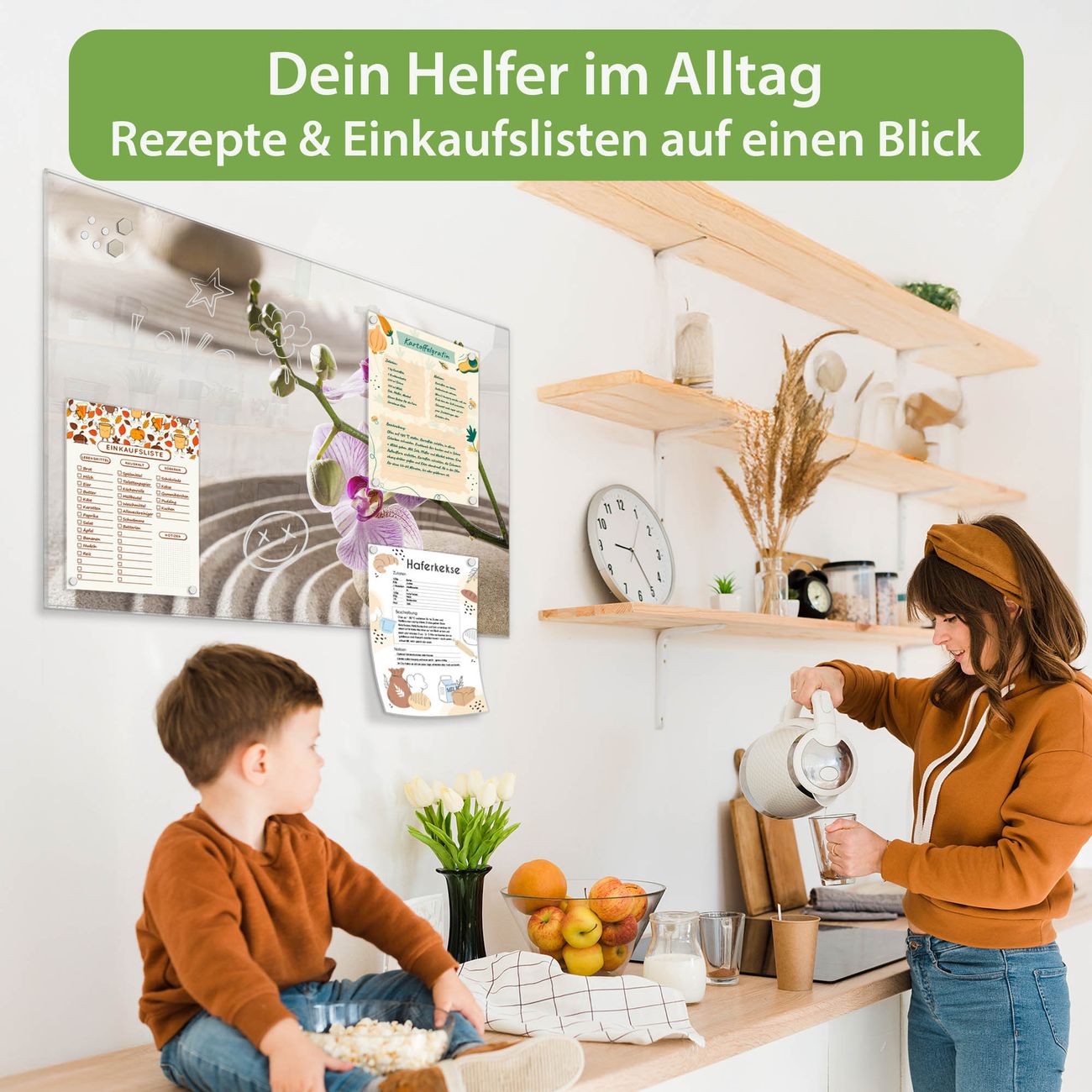 Auf der glatten Glasoberfläche lassen sich Termine, Rezepte oder Notizen ganz einfach mit Kreidestiften festhalten und rückstandslos entfernen. Starke Neodym-Magnete halten Ihre wichtigsten Erinnerungen sicher an Ort und Stelle. So entsteht Ihre ganz persönliche Ideenwand - jeden Tag neu.