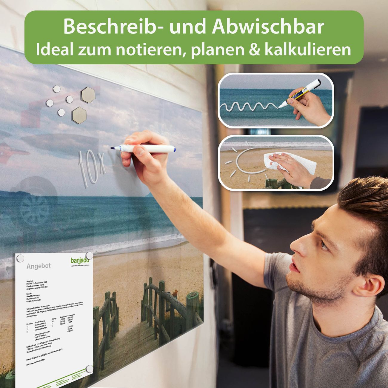 Jede Glas Magnettafel wird in unserer Werkstatt von Hand gefertigt und sorgfältig geprüft. So erhalten Sie ein echtes Qualitätsprodukt, das Funktion und Ästhetik perfekt vereint.?? Warum banjado?