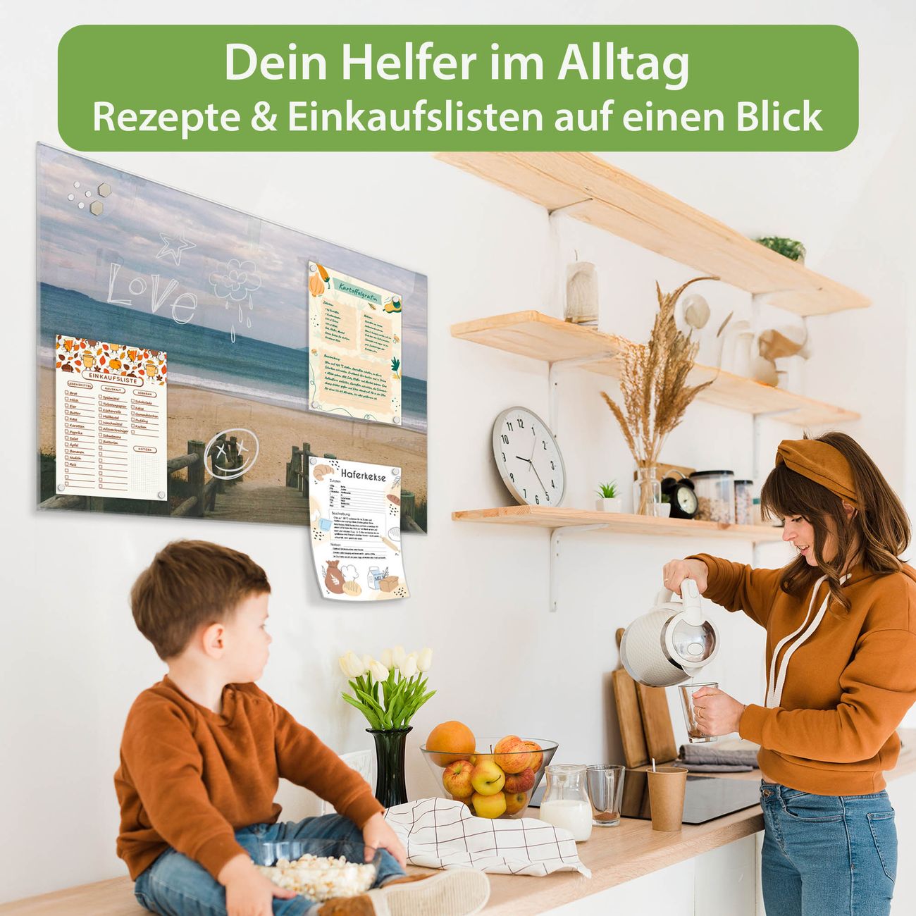 Auf der glatten Glasoberfläche lassen sich Termine, Rezepte oder Notizen ganz einfach mit Kreidestiften festhalten und rückstandslos entfernen. Starke Neodym-Magnete halten Ihre wichtigsten Erinnerungen sicher an Ort und Stelle. So entsteht Ihre ganz persönliche Ideenwand - jeden Tag neu.
