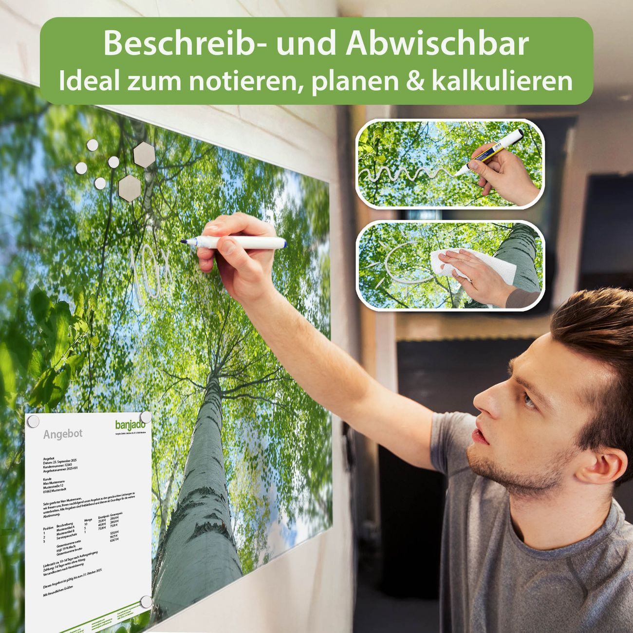 Jede Glas Magnettafel wird in unserer Werkstatt von Hand gefertigt und sorgfältig geprüft. So erhalten Sie ein echtes Qualitätsprodukt, das Funktion und Ästhetik perfekt vereint.?? Warum banjado?