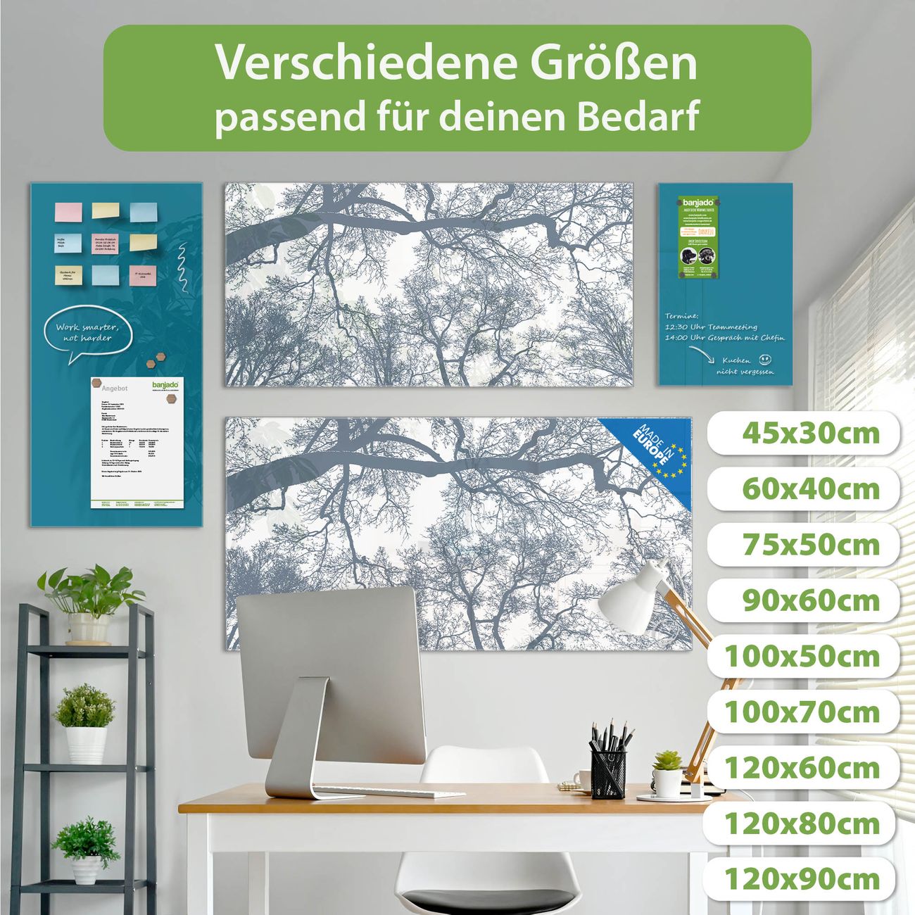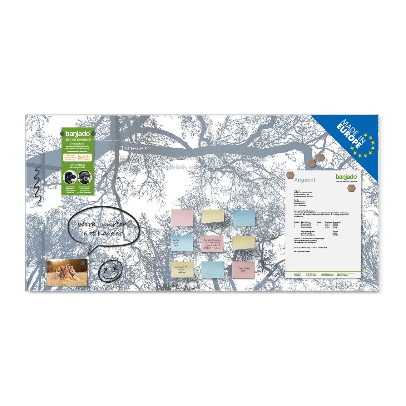 Jede Glas Magnettafel wird in unserer Werkstatt von Hand gefertigt und sorgfältig geprüft. So erhalten Sie ein echtes Qualitätsprodukt, das Funktion und Ästhetik perfekt vereint.?? Warum banjado?