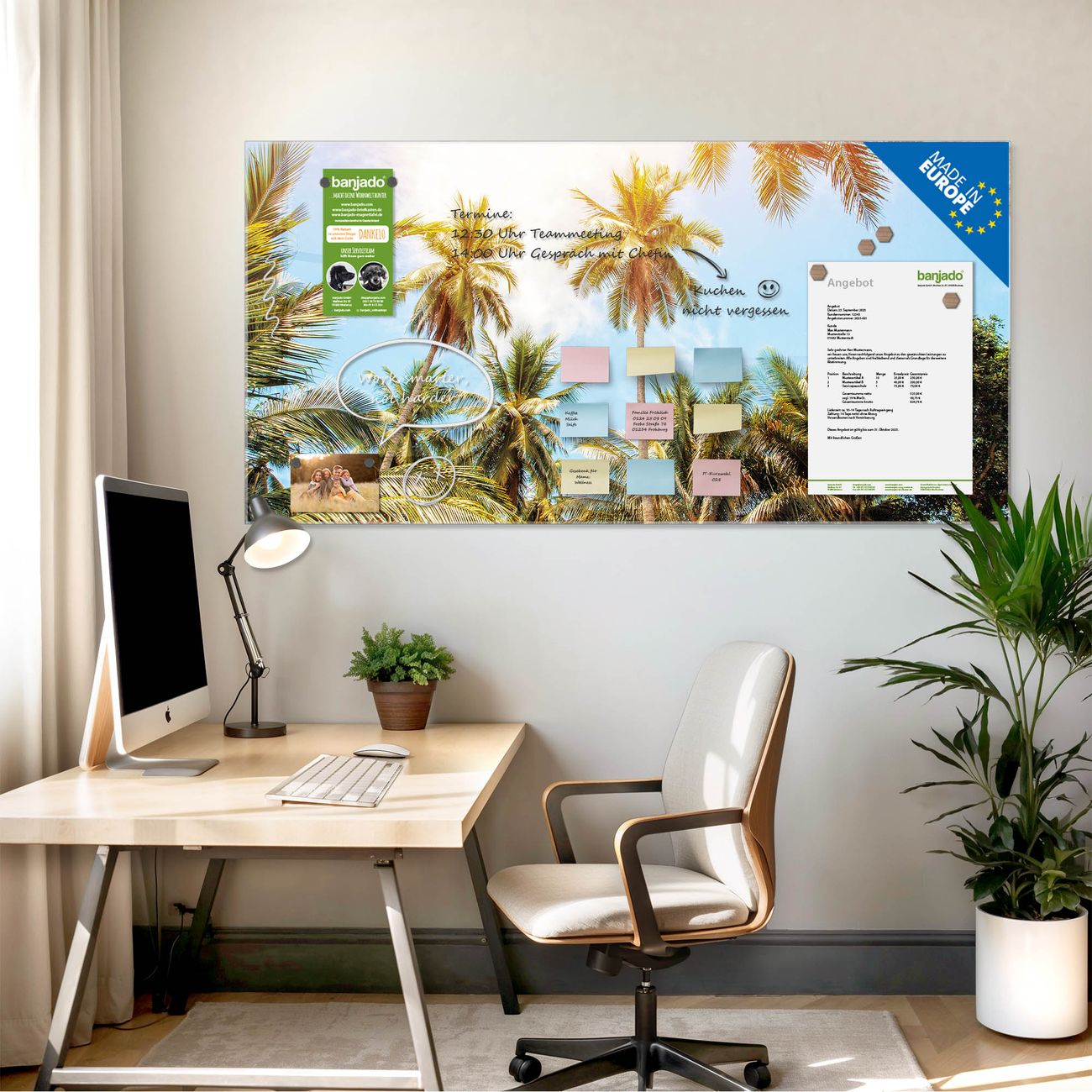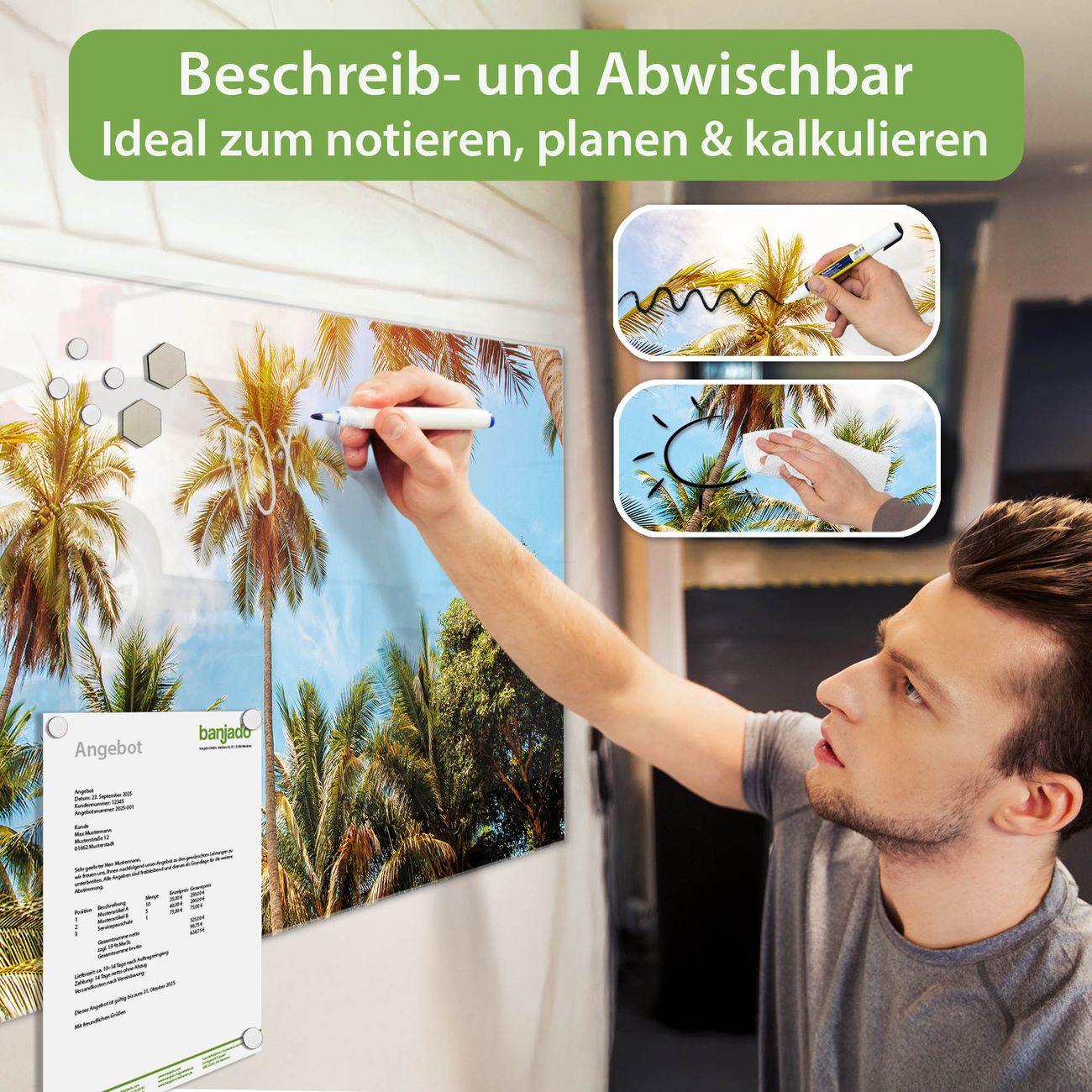 Jede Glas Magnettafel wird in unserer Werkstatt von Hand gefertigt und sorgfältig geprüft. So erhalten Sie ein echtes Qualitätsprodukt, das Funktion und Ästhetik perfekt vereint.?? Warum banjado?