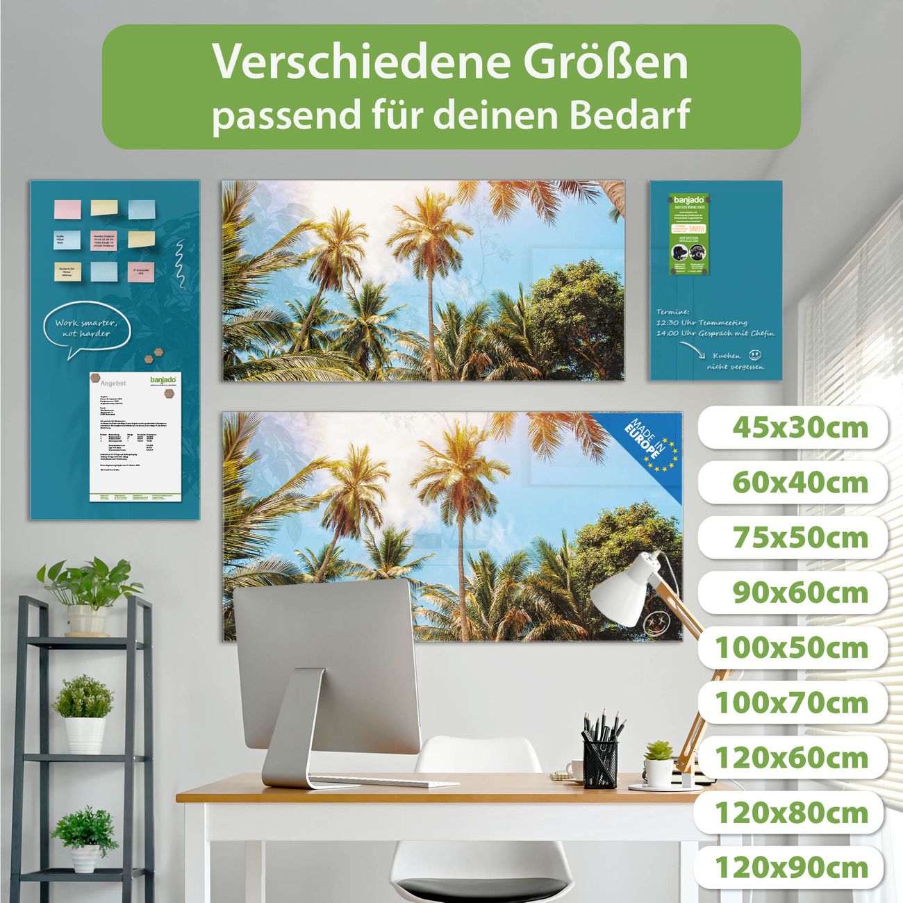 Die banjado Glas Magnettafel mit dem Motiv Motiv Zwischen Palmen verbindet Funktionalität mit Stil. Sie ersetzt das Zettelchaos durch klare Strukturen und bringt dabei eine warme, natürliche Atmosphäre in Ihr Zuhause. Ob im Büro, in der Küche oder im Eingangsbereich - dieses Design-Board zieht Blicke an und sorgt für Ordnung mit Charakter.