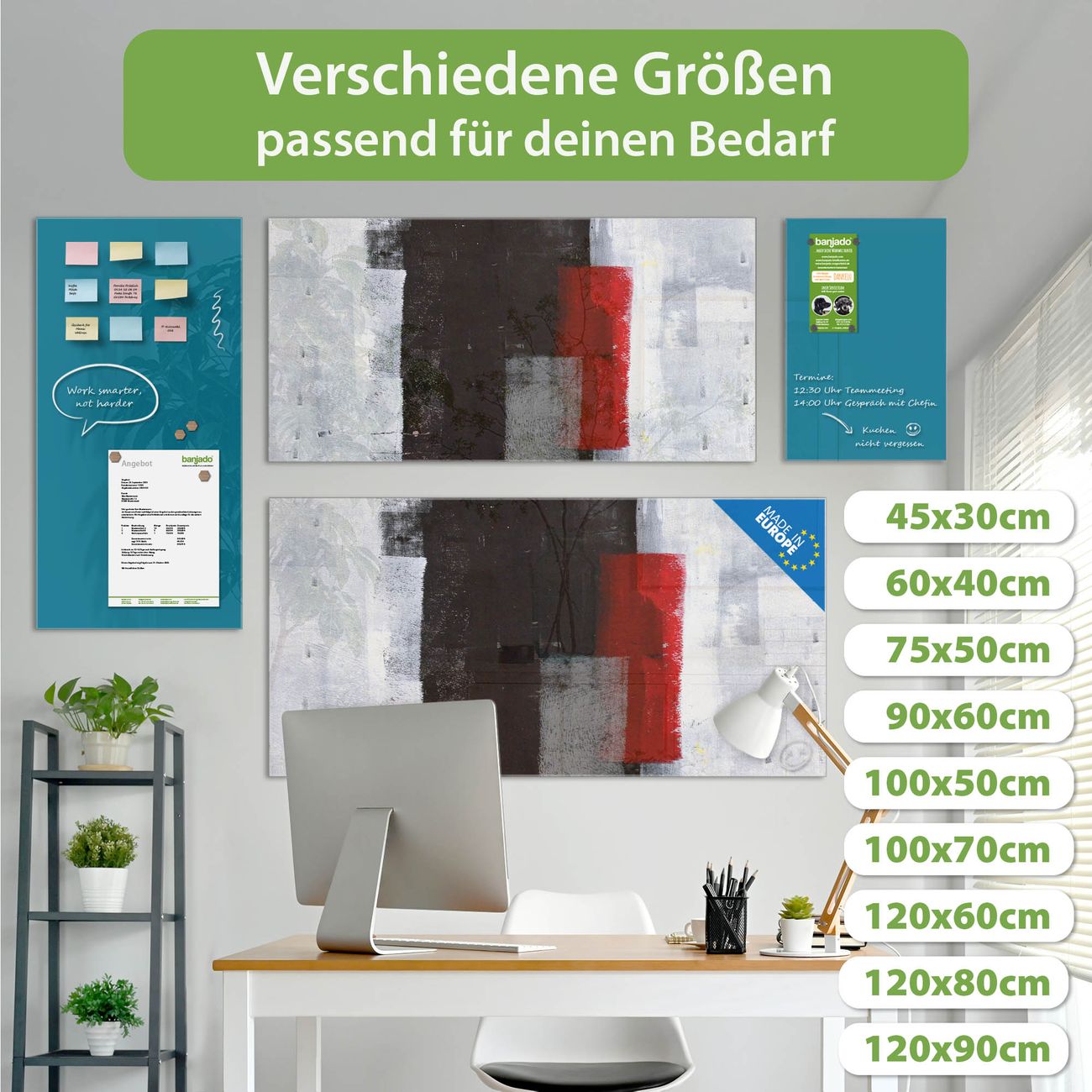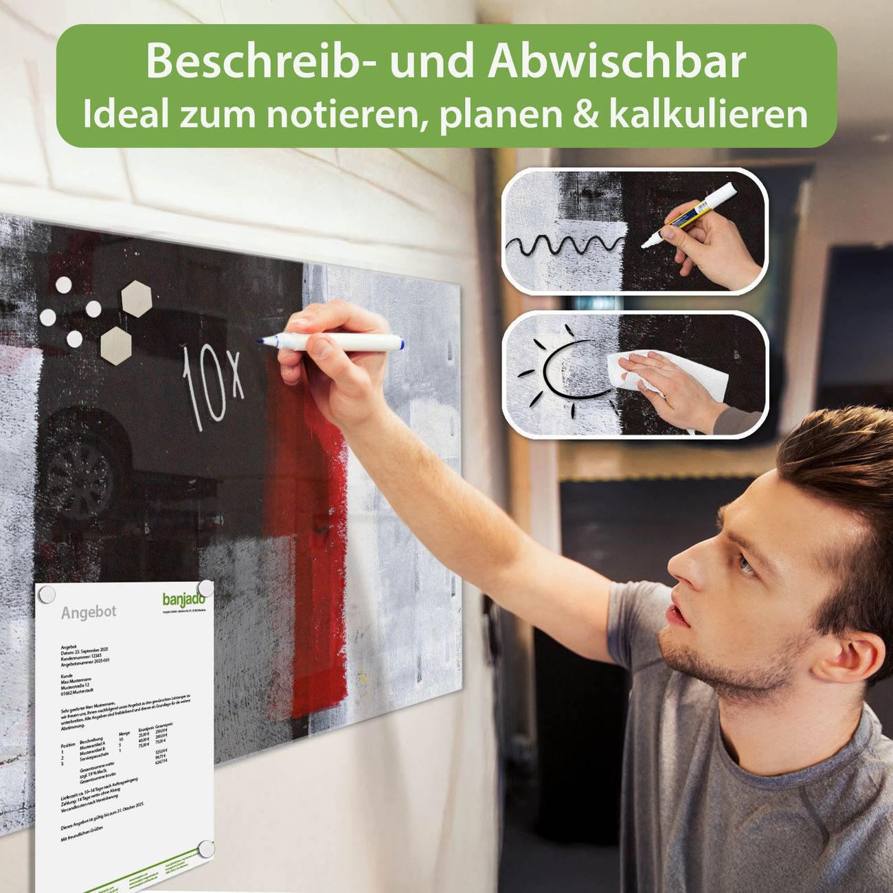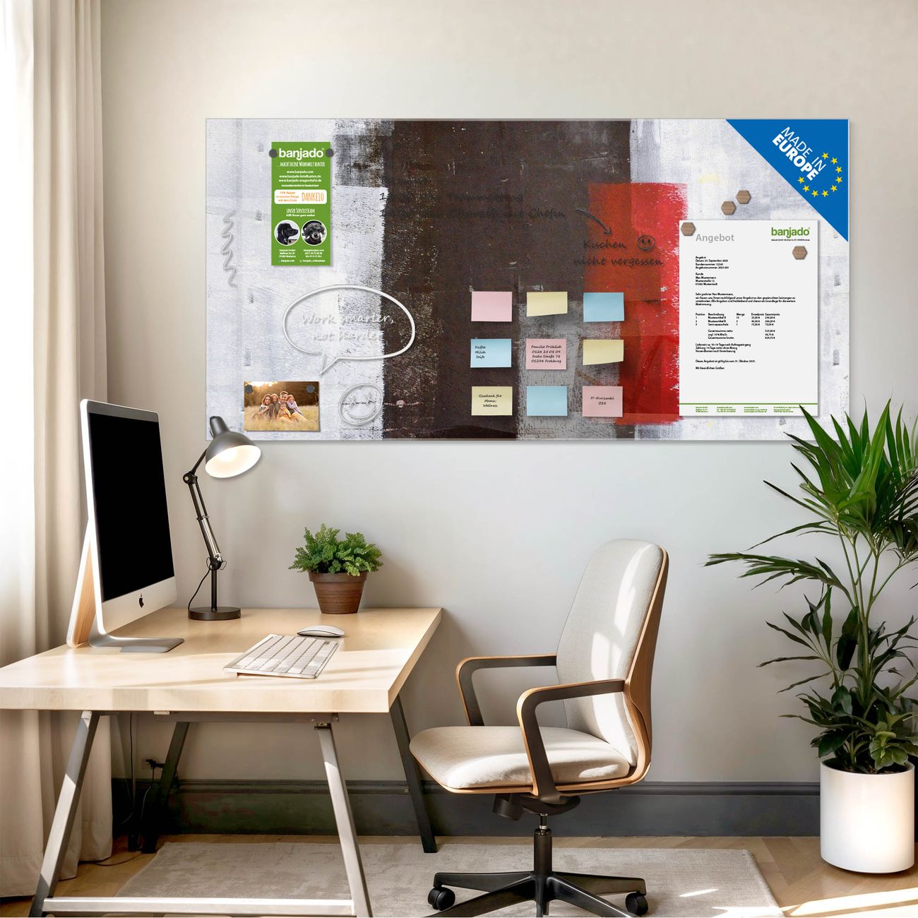 Jede Glas Magnettafel wird in unserer Werkstatt von Hand gefertigt und sorgfältig geprüft. So erhalten Sie ein echtes Qualitätsprodukt, das Funktion und Ästhetik perfekt vereint.?? Warum banjado?