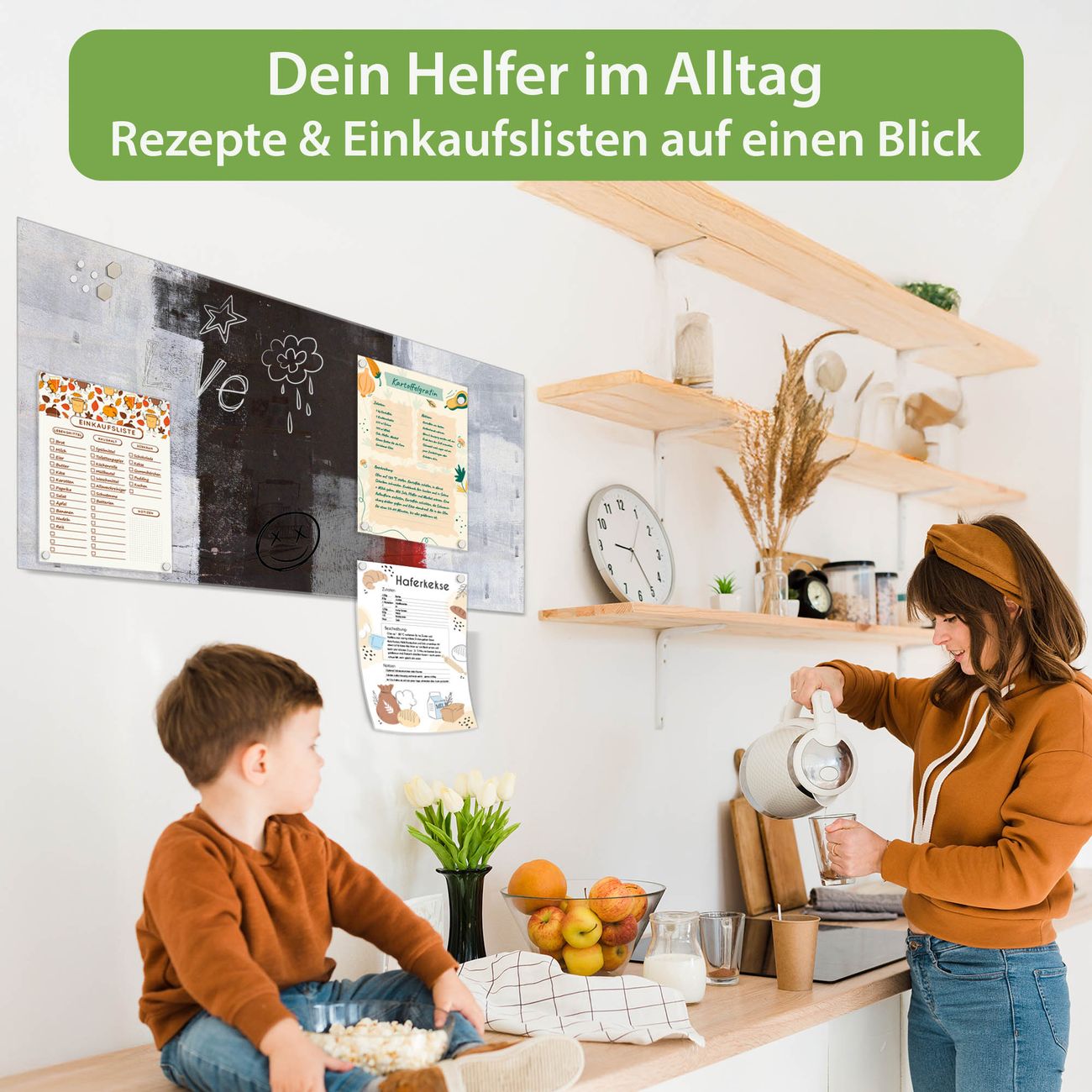 Auf der glatten Glasoberfläche lassen sich Termine, Rezepte oder Notizen ganz einfach mit Kreidestiften festhalten und rückstandslos entfernen. Starke Neodym-Magnete halten Ihre wichtigsten Erinnerungen sicher an Ort und Stelle. So entsteht Ihre ganz persönliche Ideenwand - jeden Tag neu.