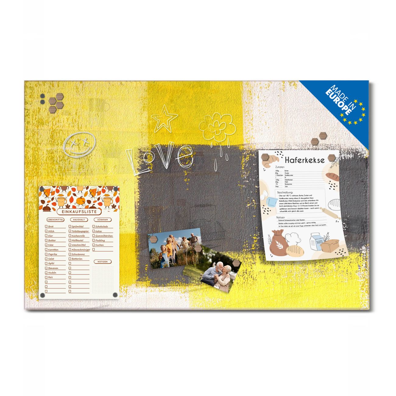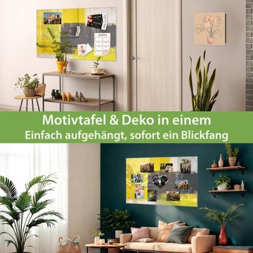 Ein Stück Design, das Ihren Alltag organisiert. Schreiben, heften, inspirieren - alles an einem Ort. Qualität, die man spürt. Montage leicht gemacht. Handwerk mit Herz - veredelt in Sachsen. Einzigartiges Design mit Motiv Motiv Abstrakt Gelb Beschreibbare Glasoberfläche, leicht zu reinigen Starke Magnetkraft durch Stahlrückwand Inklusive 4 Neodym-Magneten Flexible Montageoptionen Handveredelt in Sachsen - Qualität, die bleibt