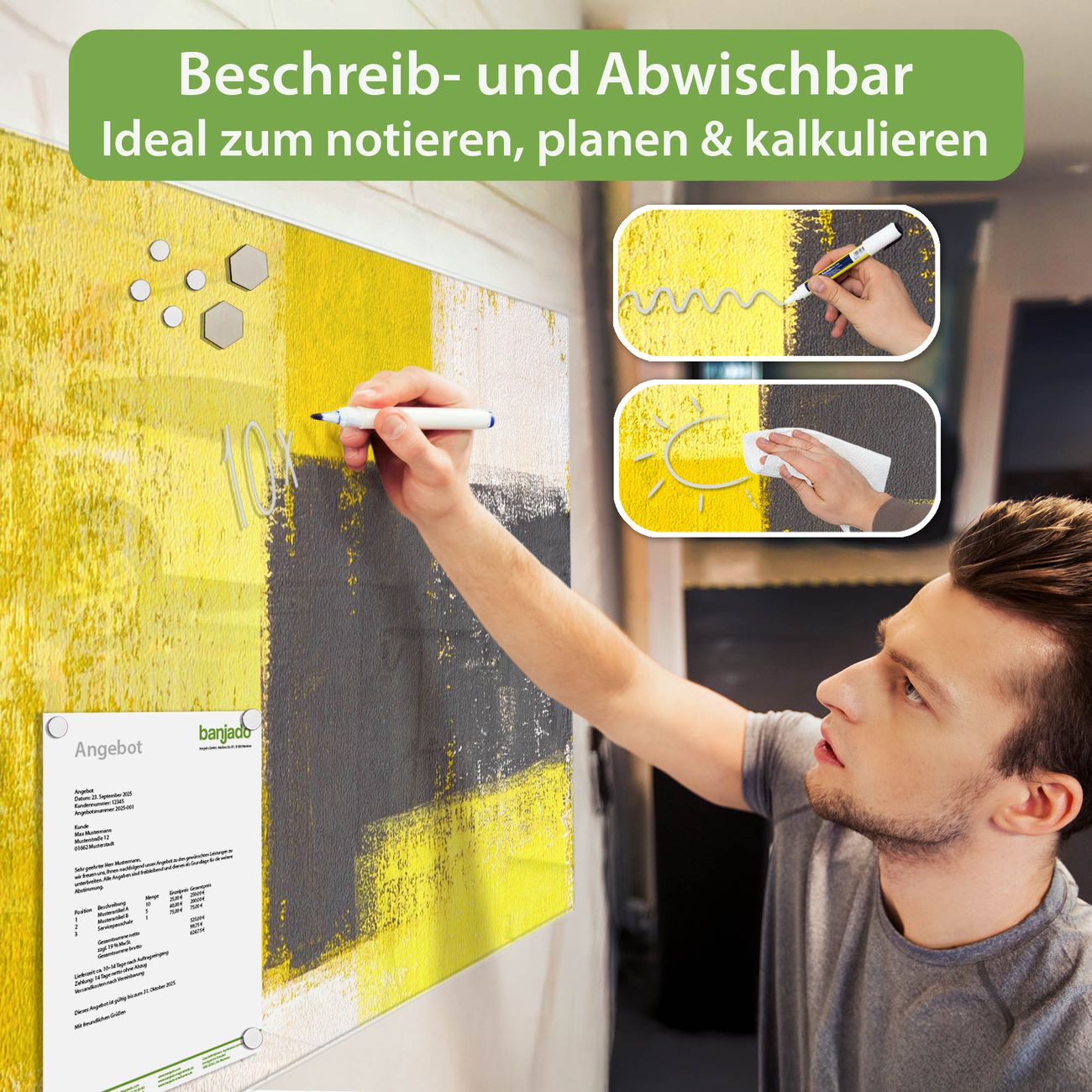 Jede Glas Magnettafel wird in unserer Werkstatt von Hand gefertigt und sorgfältig geprüft. So erhalten Sie ein echtes Qualitätsprodukt, das Funktion und Ästhetik perfekt vereint.?? Warum banjado?