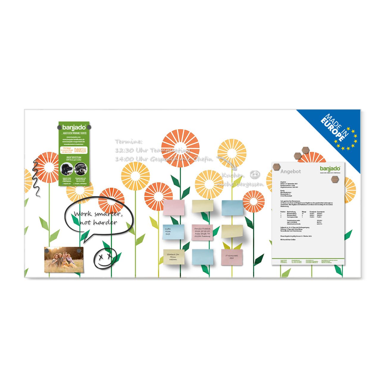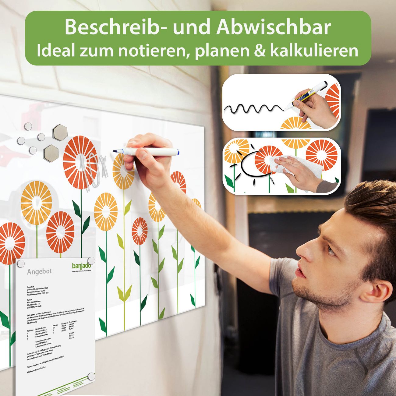 Jede Glas Magnettafel wird in unserer Werkstatt von Hand gefertigt und sorgfältig geprüft. So erhalten Sie ein echtes Qualitätsprodukt, das Funktion und Ästhetik perfekt vereint.?? Warum banjado?