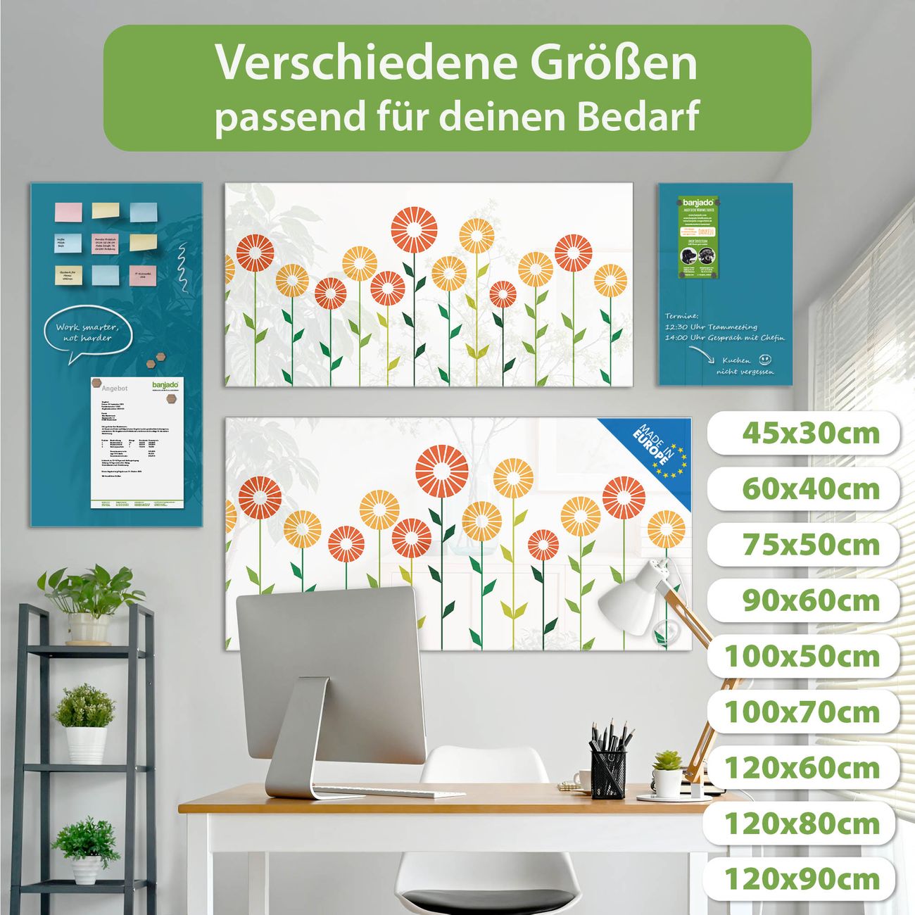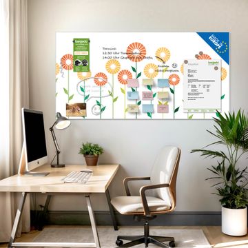 Ein Stück Design, das Ihren Alltag organisiert. Schreiben, heften, inspirieren - alles an einem Ort. Qualität, die man spürt. Montage leicht gemacht. Handwerk mit Herz - veredelt in Sachsen. Einzigartiges Design mit Motiv Motiv Abstrakte Margeriten Beschreibbare Glasoberfläche, leicht zu reinigen Starke Magnetkraft durch Stahlrückwand Inklusive 4 Neodym-Magneten Flexible Montageoptionen Handveredelt in Sachsen - Qualität, die bleibt