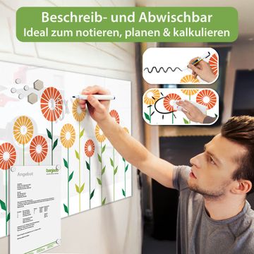 Die banjado Glas Magnettafel mit dem Motiv Motiv Abstrakte Margeriten verbindet Funktionalität mit Stil. Sie ersetzt das Zettelchaos durch klare Strukturen und bringt dabei eine warme, natürliche Atmosphäre in Ihr Zuhause. Ob im Büro, in der Küche oder im Eingangsbereich - dieses Design-Board zieht Blicke an und sorgt für Ordnung mit Charakter.