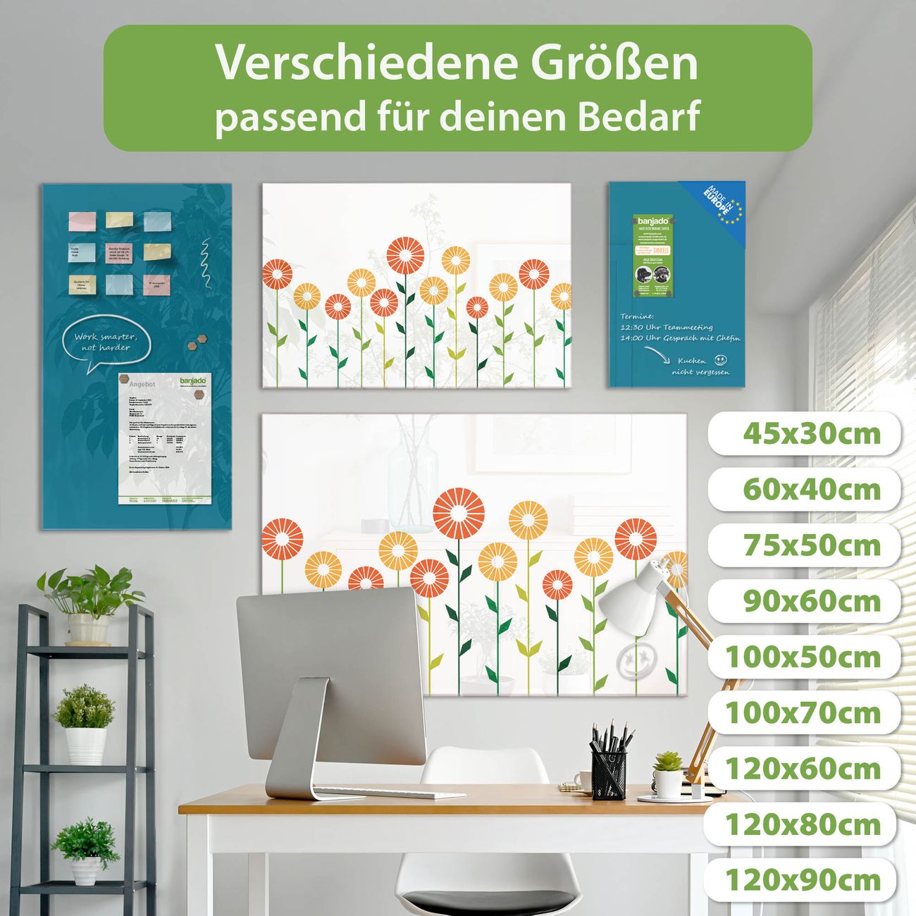 Ein Stück Design, das Ihren Alltag organisiert. Schreiben, heften, inspirieren - alles an einem Ort. Qualität, die man spürt. Montage leicht gemacht. Handwerk mit Herz - veredelt in Sachsen. Einzigartiges Design mit Motiv Motiv Abstrakte Margeriten Beschreibbare Glasoberfläche, leicht zu reinigen Starke Magnetkraft durch Stahlrückwand Inklusive 4 Neodym-Magneten Flexible Montageoptionen Handveredelt in Sachsen - Qualität, die bleibt