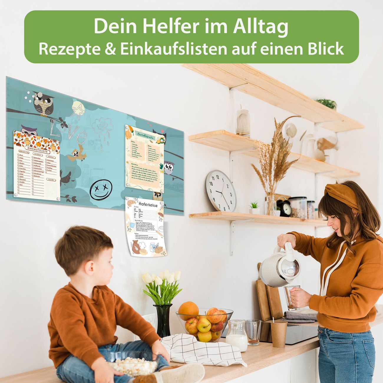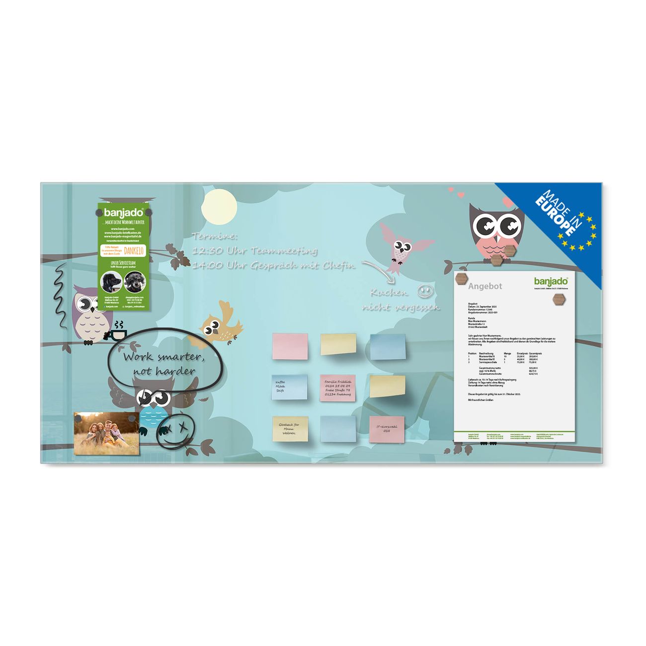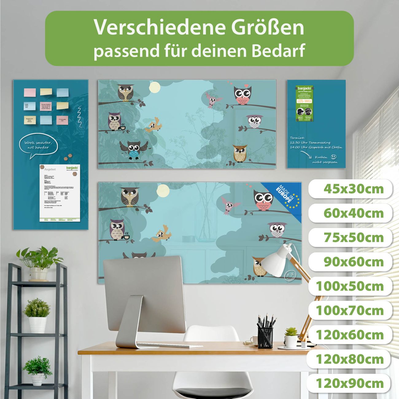 Ein Stück Design, das Ihren Alltag organisiert. Schreiben, heften, inspirieren - alles an einem Ort. Qualität, die man spürt. Montage leicht gemacht. Handwerk mit Herz - veredelt in Sachsen. Einzigartiges Design mit Motiv Motiv Acht Eulen Beschreibbare Glasoberfläche, leicht zu reinigen Starke Magnetkraft durch Stahlrückwand Inklusive 4 Neodym-Magneten Flexible Montageoptionen Handveredelt in Sachsen - Qualität, die bleibt