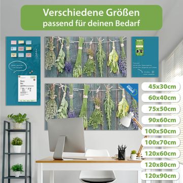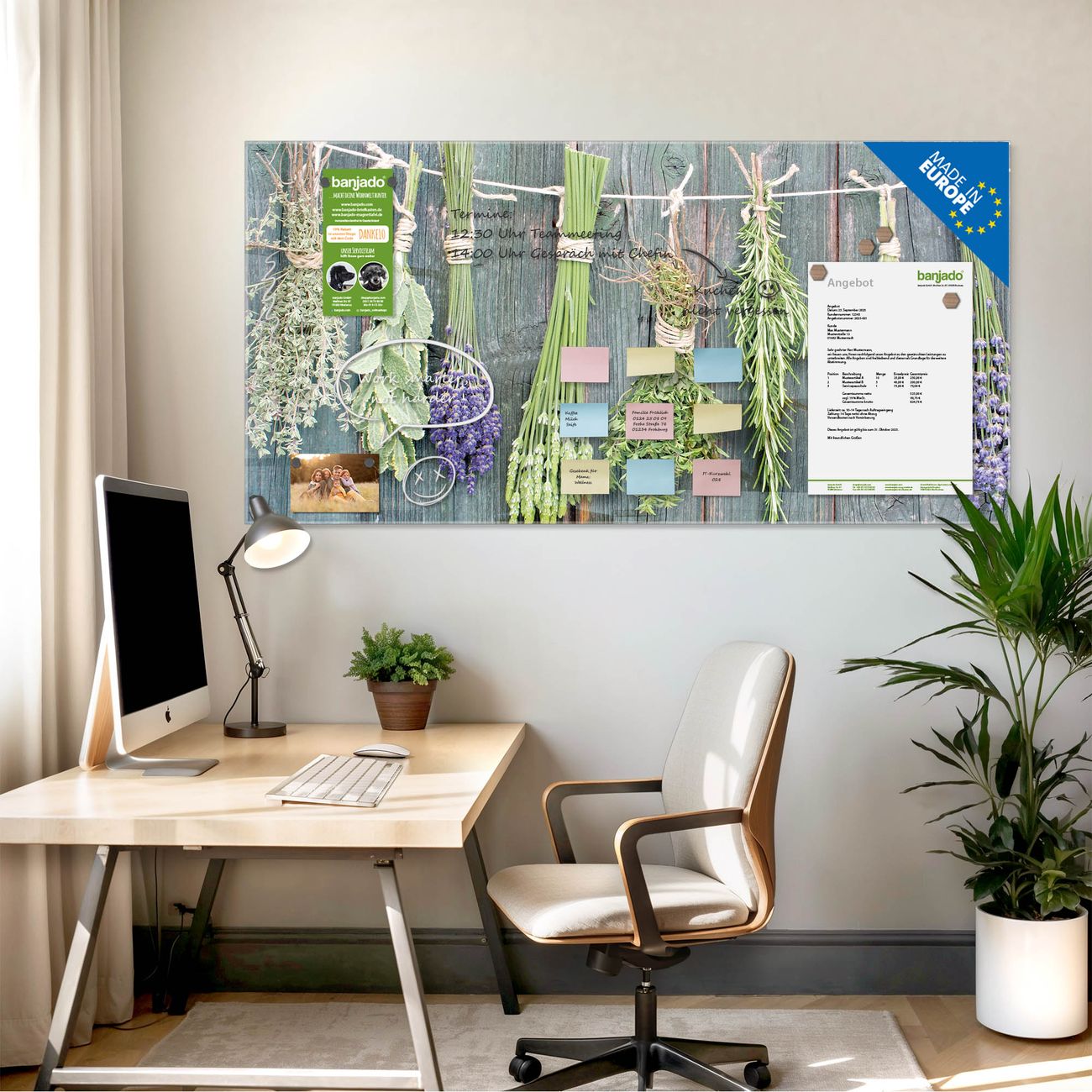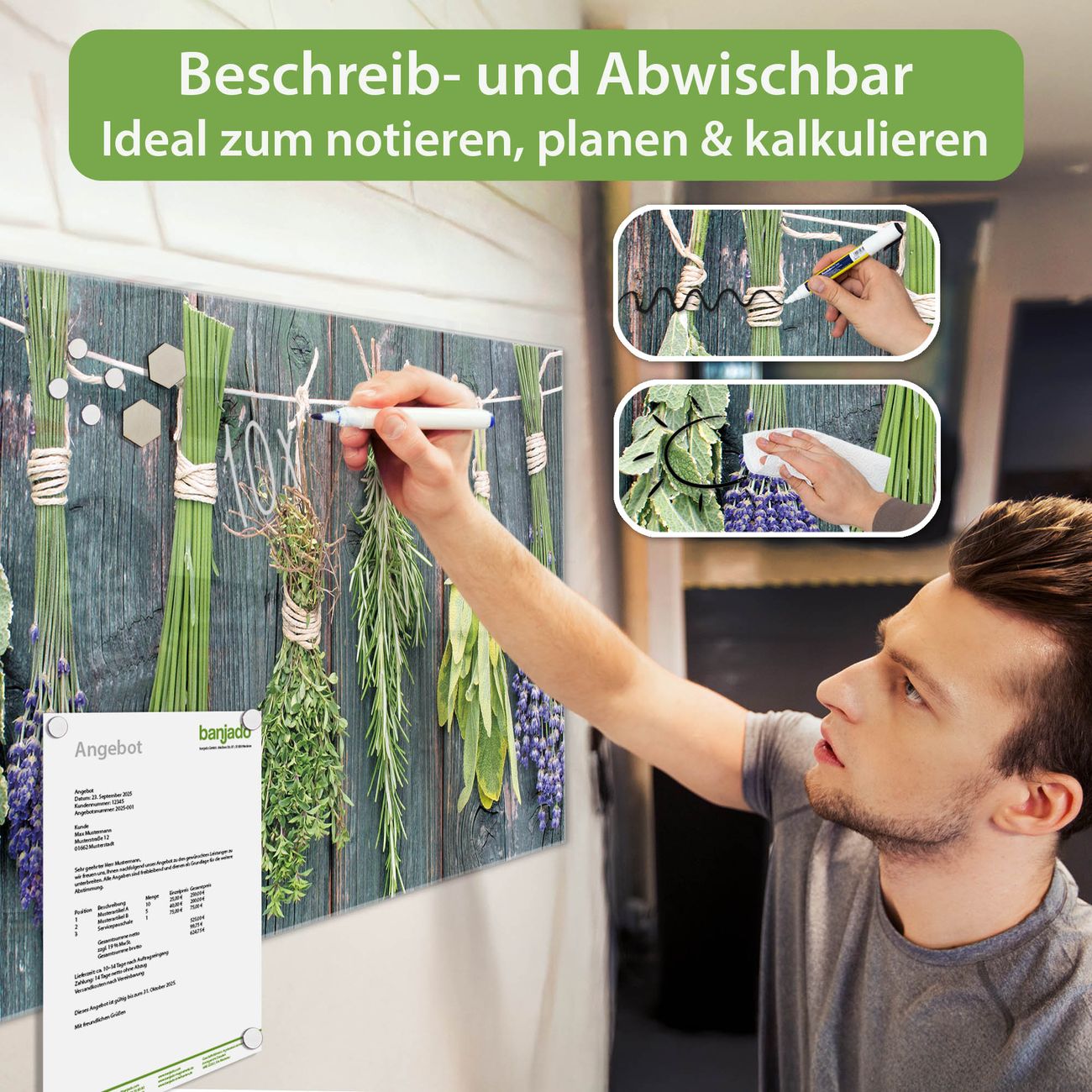 Die banjado Glas Magnettafel mit dem Motiv Motiv Acht Kräuter verbindet Funktionalität mit Stil. Sie ersetzt das Zettelchaos durch klare Strukturen und bringt dabei eine warme, natürliche Atmosphäre in Ihr Zuhause. Ob im Büro, in der Küche oder im Eingangsbereich - dieses Design-Board zieht Blicke an und sorgt für Ordnung mit Charakter.
