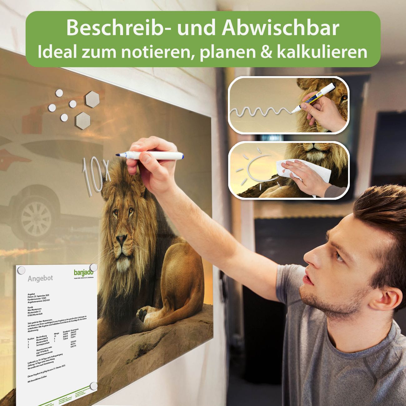 Jede Glas Magnettafel wird in unserer Werkstatt von Hand gefertigt und sorgfältig geprüft. So erhalten Sie ein echtes Qualitätsprodukt, das Funktion und Ästhetik perfekt vereint.?? Warum banjado?