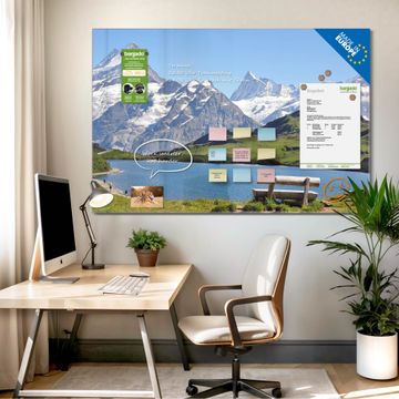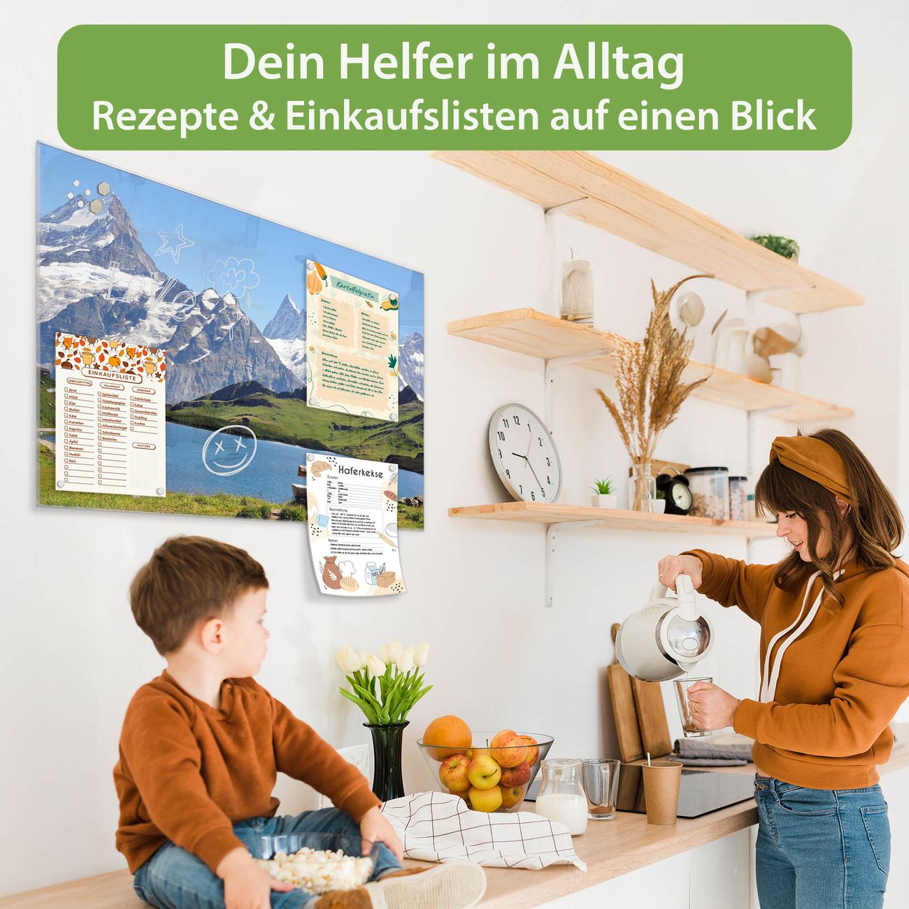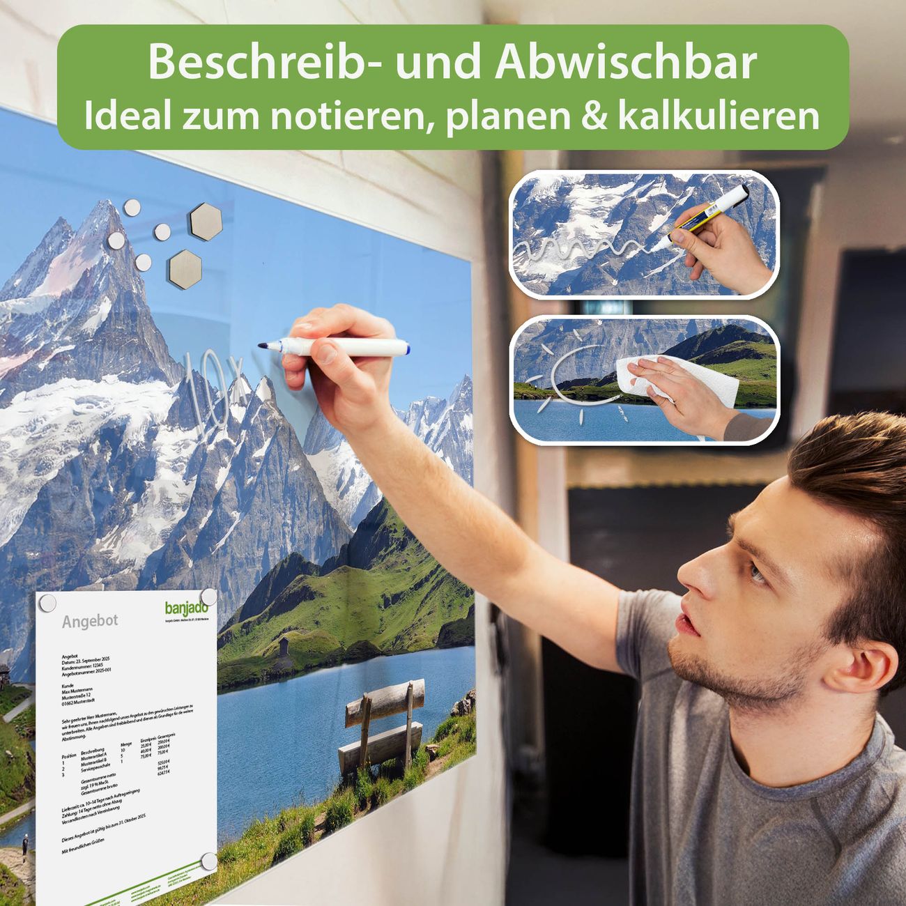 Die banjado Glas Magnettafel mit dem Motiv Motiv Alpen verbindet Funktionalität mit Stil. Sie ersetzt das Zettelchaos durch klare Strukturen und bringt dabei eine warme, natürliche Atmosphäre in Ihr Zuhause. Ob im Büro, in der Küche oder im Eingangsbereich - dieses Design-Board zieht Blicke an und sorgt für Ordnung mit Charakter.
