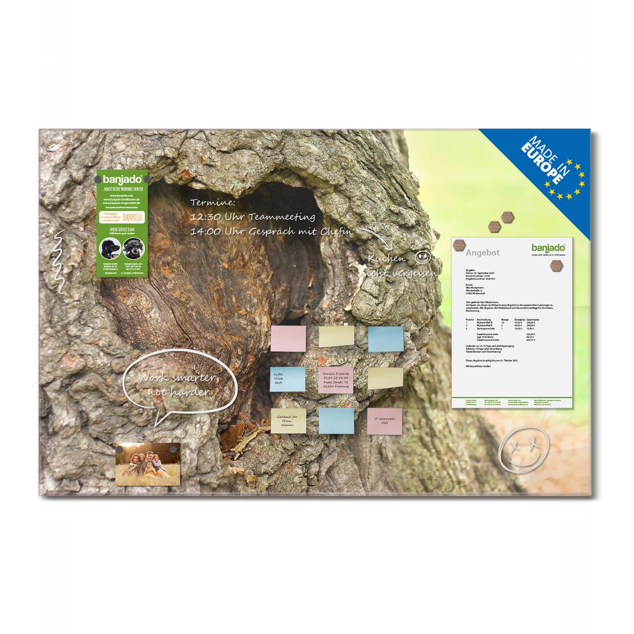Jede Glas Magnettafel wird in unserer Werkstatt von Hand gefertigt und sorgfältig geprüft. So erhalten Sie ein echtes Qualitätsprodukt, das Funktion und Ästhetik perfekt vereint.?? Warum banjado?