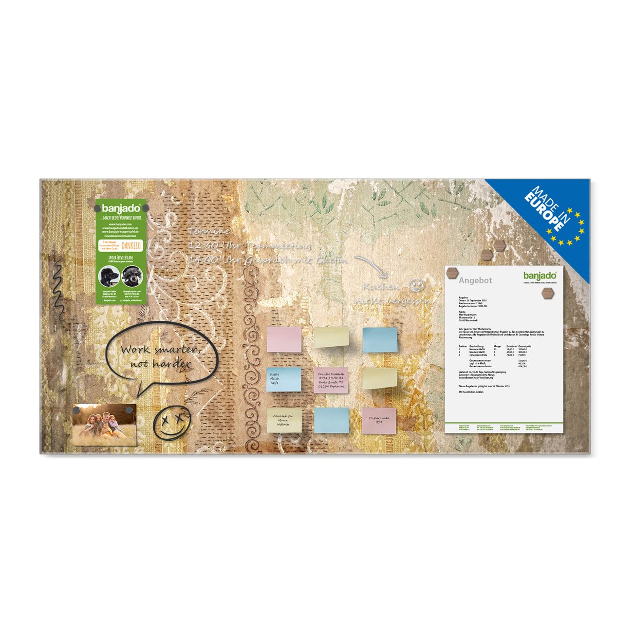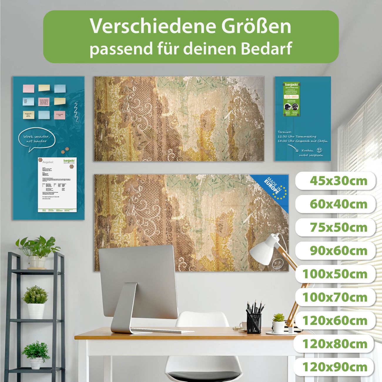 Jede Glas Magnettafel wird in unserer Werkstatt von Hand gefertigt und sorgfältig geprüft. So erhalten Sie ein echtes Qualitätsprodukt, das Funktion und Ästhetik perfekt vereint.?? Warum banjado?