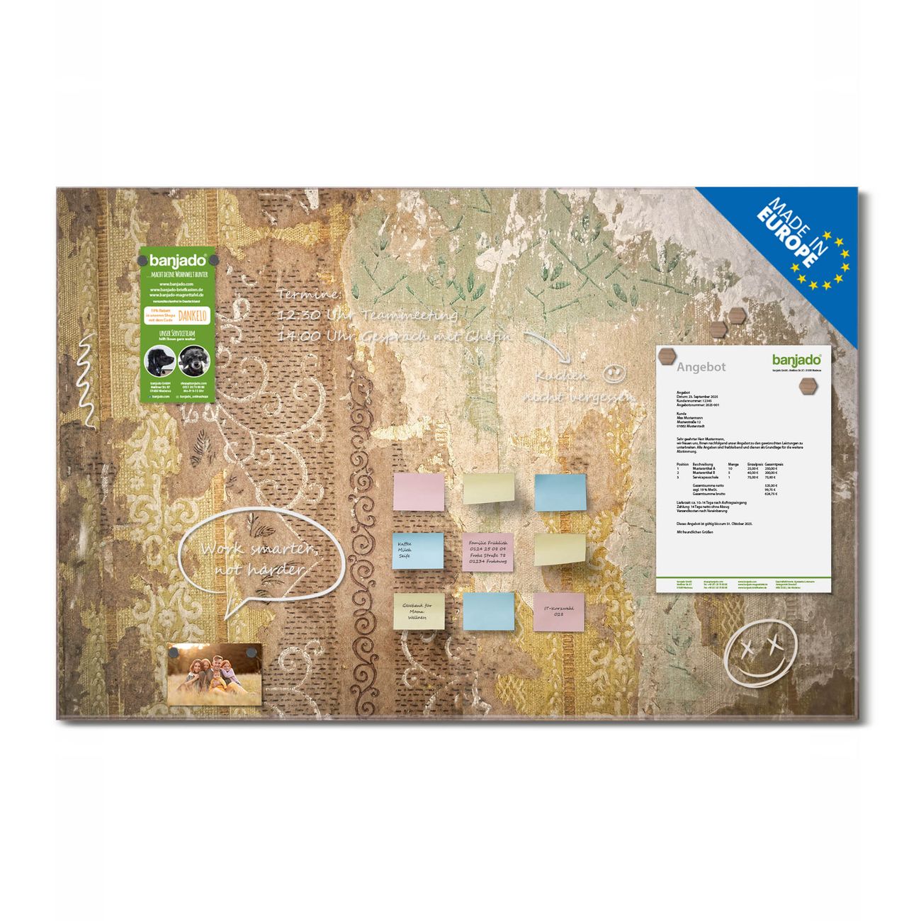 Jede Glas Magnettafel wird in unserer Werkstatt von Hand gefertigt und sorgfältig geprüft. So erhalten Sie ein echtes Qualitätsprodukt, das Funktion und Ästhetik perfekt vereint.?? Warum banjado?