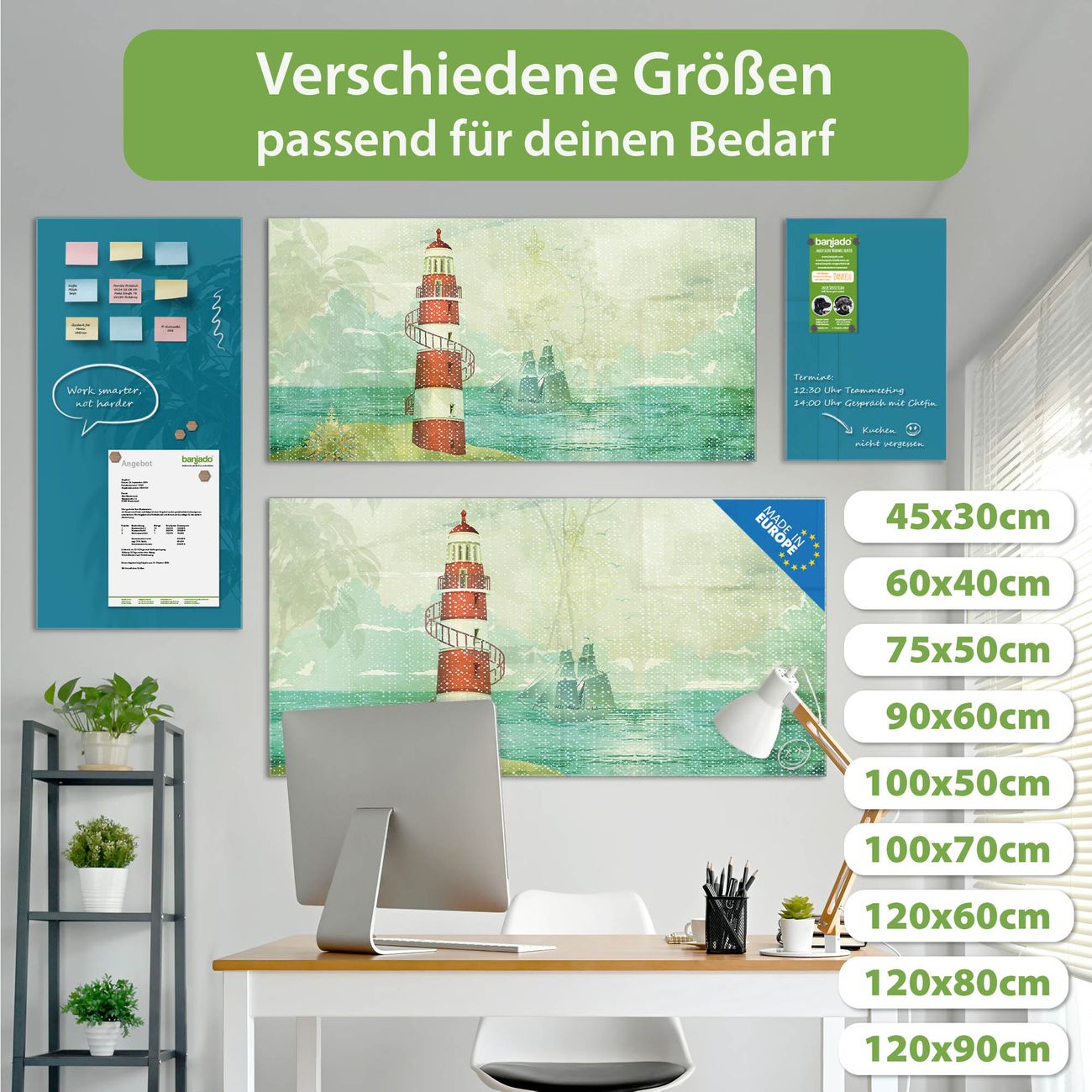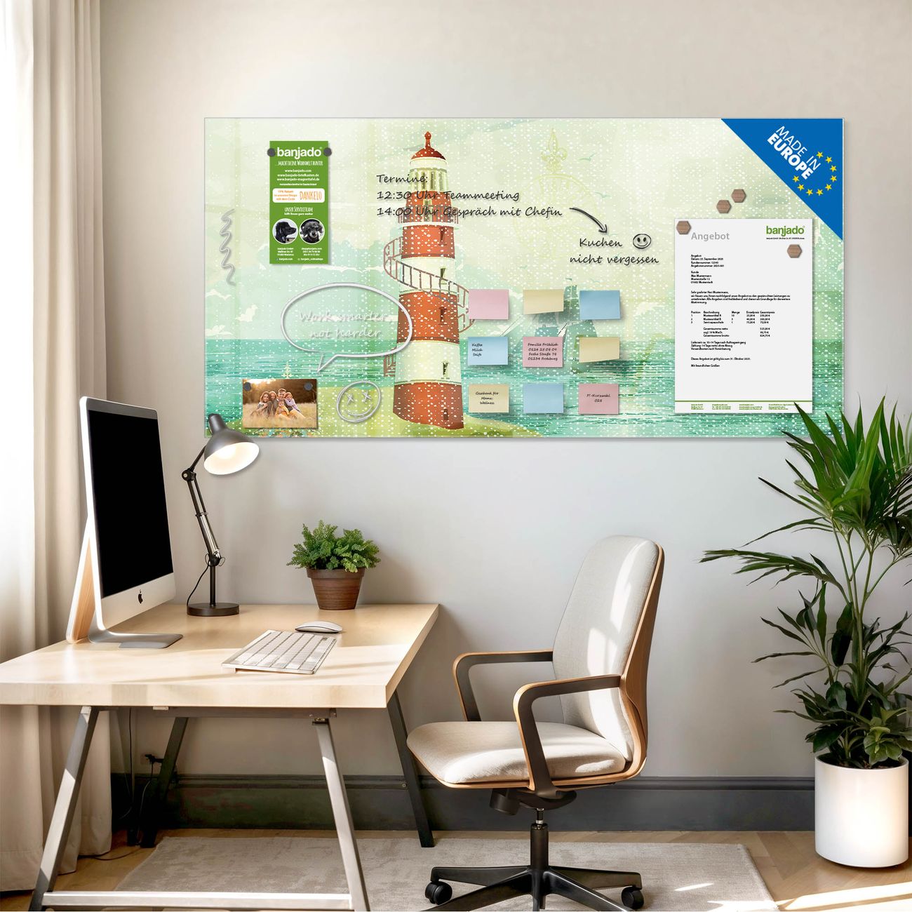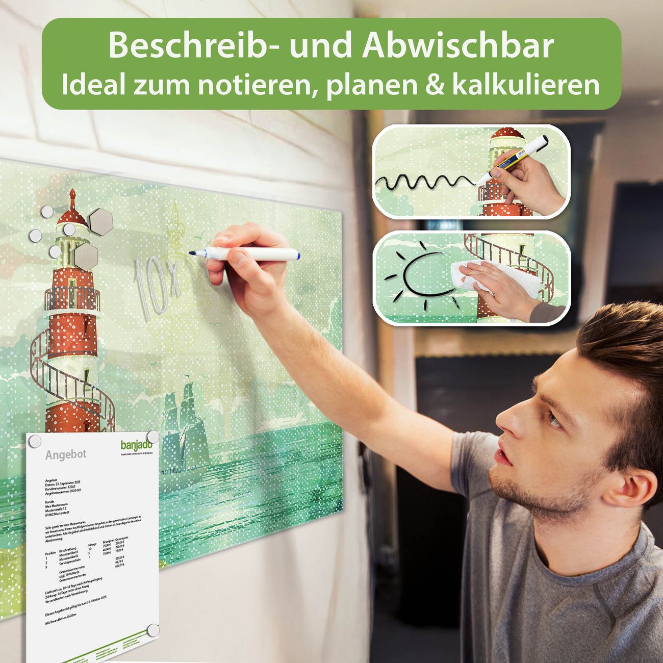 Jede Glas Magnettafel wird in unserer Werkstatt von Hand gefertigt und sorgfältig geprüft. So erhalten Sie ein echtes Qualitätsprodukt, das Funktion und Ästhetik perfekt vereint.?? Warum banjado?