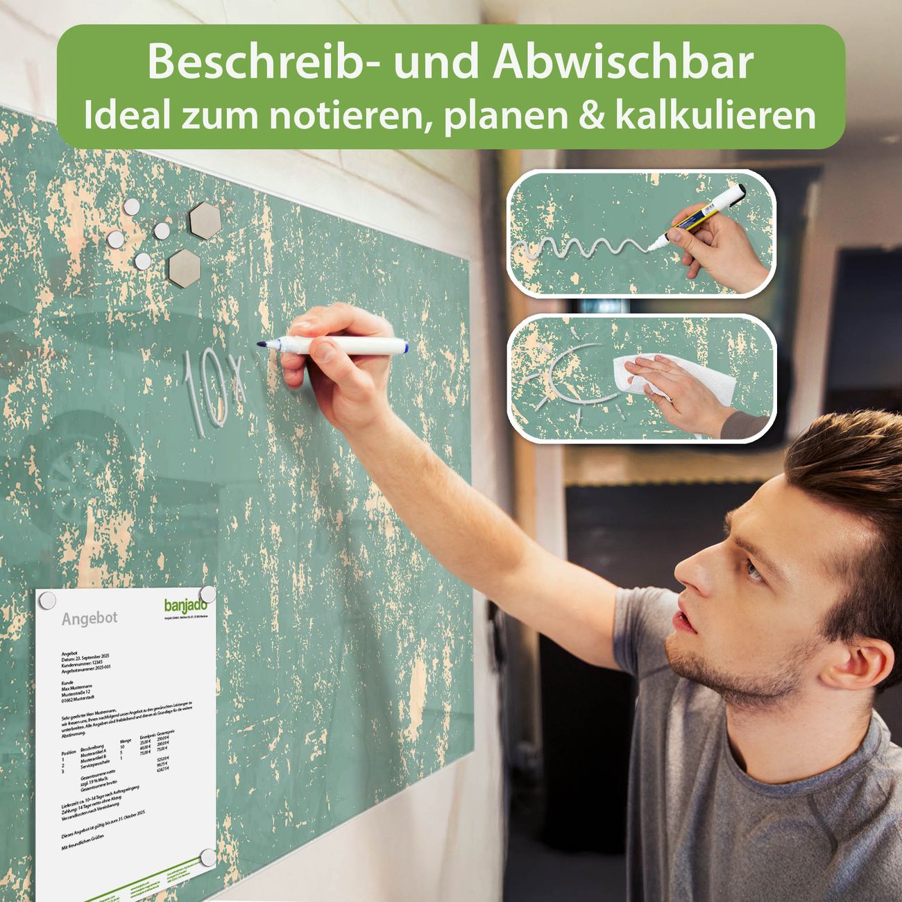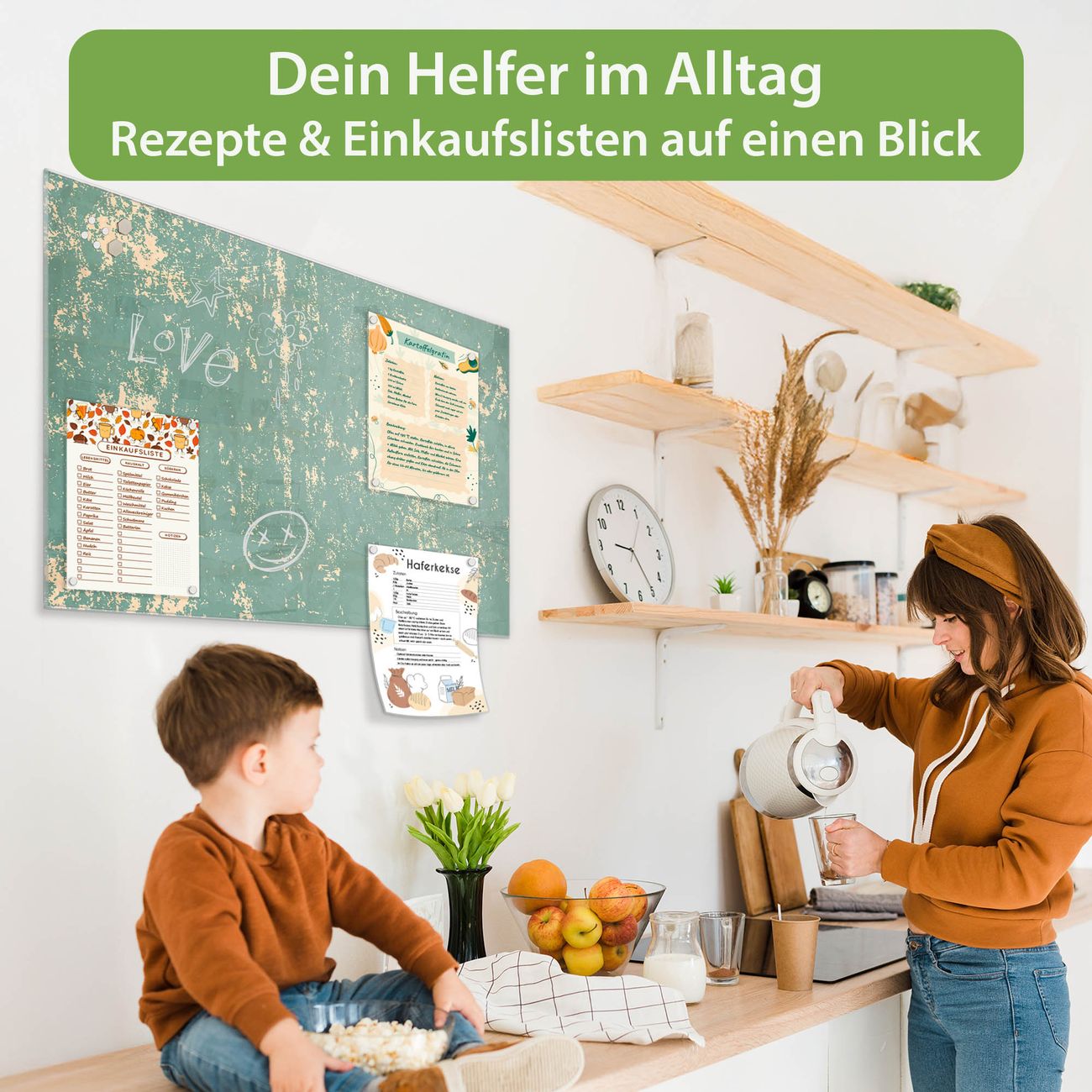 Auf der glatten Glasoberfläche lassen sich Termine, Rezepte oder Notizen ganz einfach mit Kreidestiften festhalten und rückstandslos entfernen. Starke Neodym-Magnete halten Ihre wichtigsten Erinnerungen sicher an Ort und Stelle. So entsteht Ihre ganz persönliche Ideenwand - jeden Tag neu.
