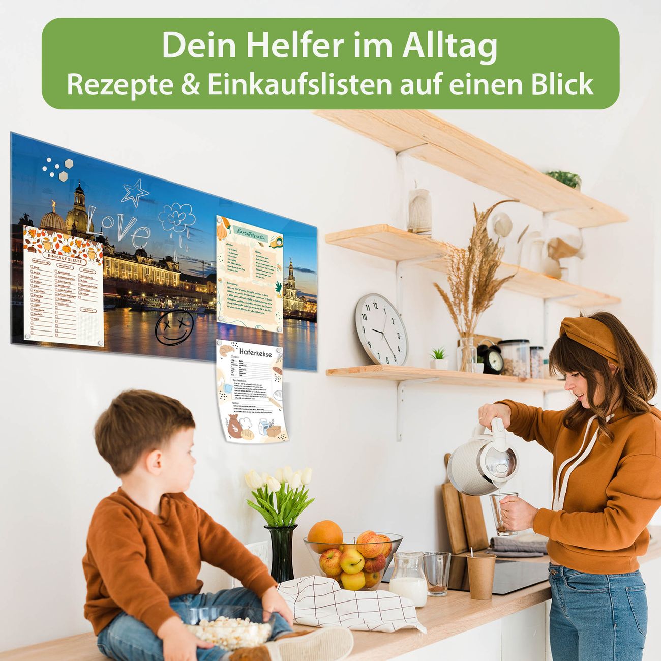 Ein Stück Design, das Ihren Alltag organisiert. Schreiben, heften, inspirieren - alles an einem Ort. Qualität, die man spürt. Montage leicht gemacht. Handwerk mit Herz - veredelt in Sachsen. Einzigartiges Design mit Motiv Motiv Altstadt Dresden Beschreibbare Glasoberfläche, leicht zu reinigen Starke Magnetkraft durch Stahlrückwand Inklusive 4 Neodym-Magneten Flexible Montageoptionen Handveredelt in Sachsen - Qualität, die bleibt