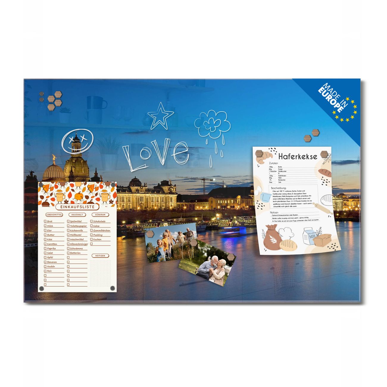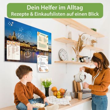 Ein Stück Design, das Ihren Alltag organisiert. Schreiben, heften, inspirieren - alles an einem Ort. Qualität, die man spürt. Montage leicht gemacht. Handwerk mit Herz - veredelt in Sachsen. Einzigartiges Design mit Motiv Motiv Altstadt Dresden Beschreibbare Glasoberfläche, leicht zu reinigen Starke Magnetkraft durch Stahlrückwand Inklusive 4 Neodym-Magneten Flexible Montageoptionen Handveredelt in Sachsen - Qualität, die bleibt