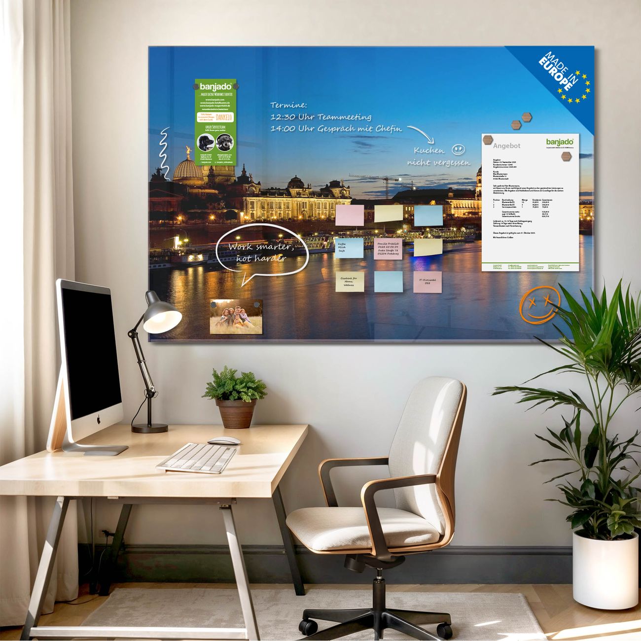 Jede Glas Magnettafel wird in unserer Werkstatt von Hand gefertigt und sorgfältig geprüft. So erhalten Sie ein echtes Qualitätsprodukt, das Funktion und Ästhetik perfekt vereint.?? Warum banjado?