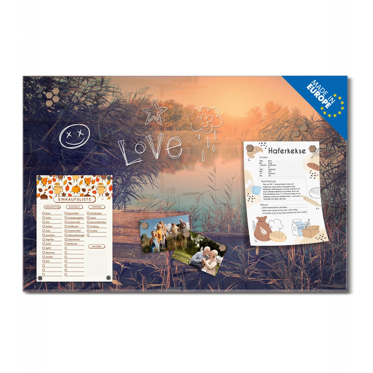 Ein Stück Design, das Ihren Alltag organisiert. Schreiben, heften, inspirieren - alles an einem Ort. Qualität, die man spürt. Montage leicht gemacht. Handwerk mit Herz - veredelt in Sachsen. Einzigartiges Design mit Motiv Motiv Bank Am See Beschreibbare Glasoberfläche, leicht zu reinigen Starke Magnetkraft durch Stahlrückwand Inklusive 4 Neodym-Magneten Flexible Montageoptionen Handveredelt in Sachsen - Qualität, die bleibt