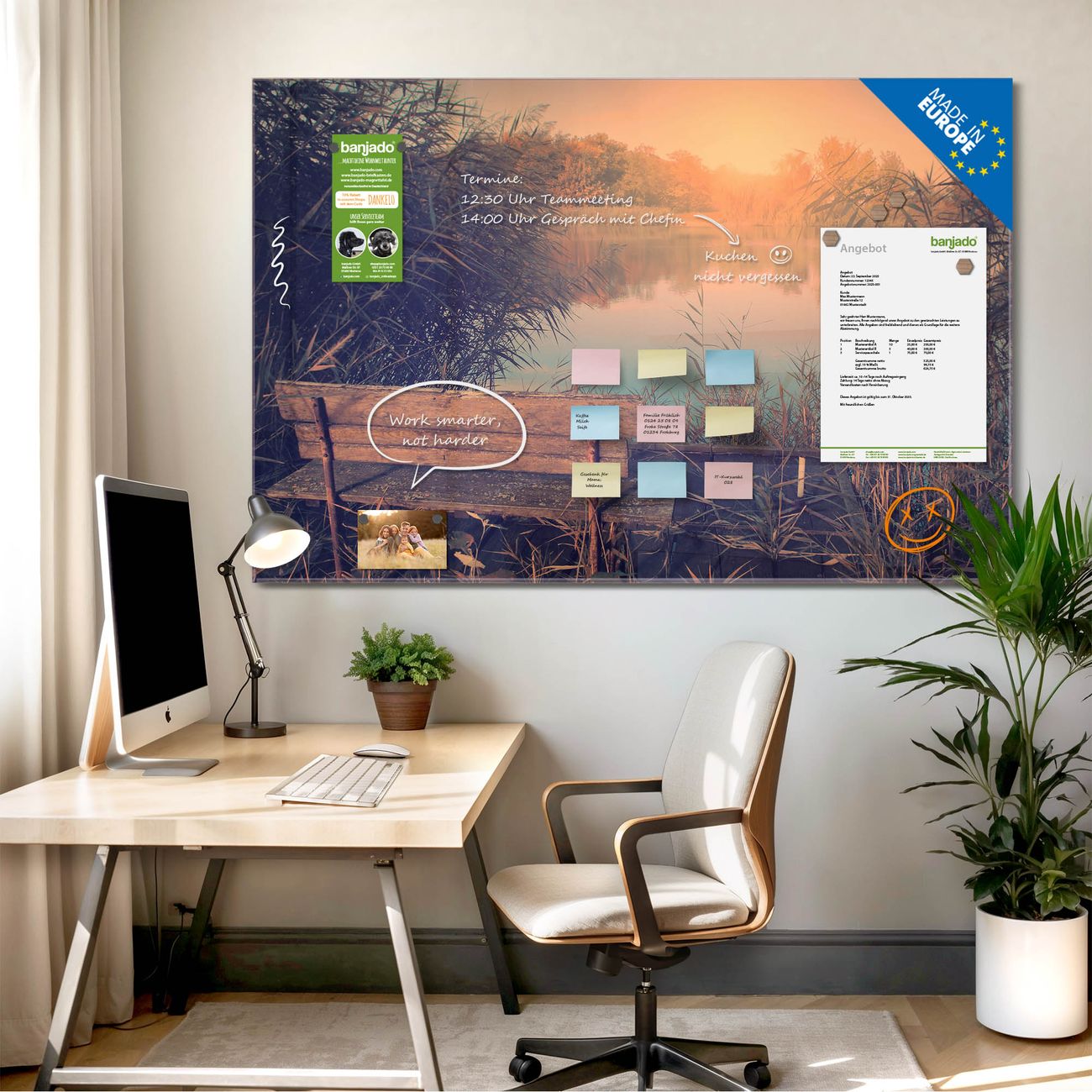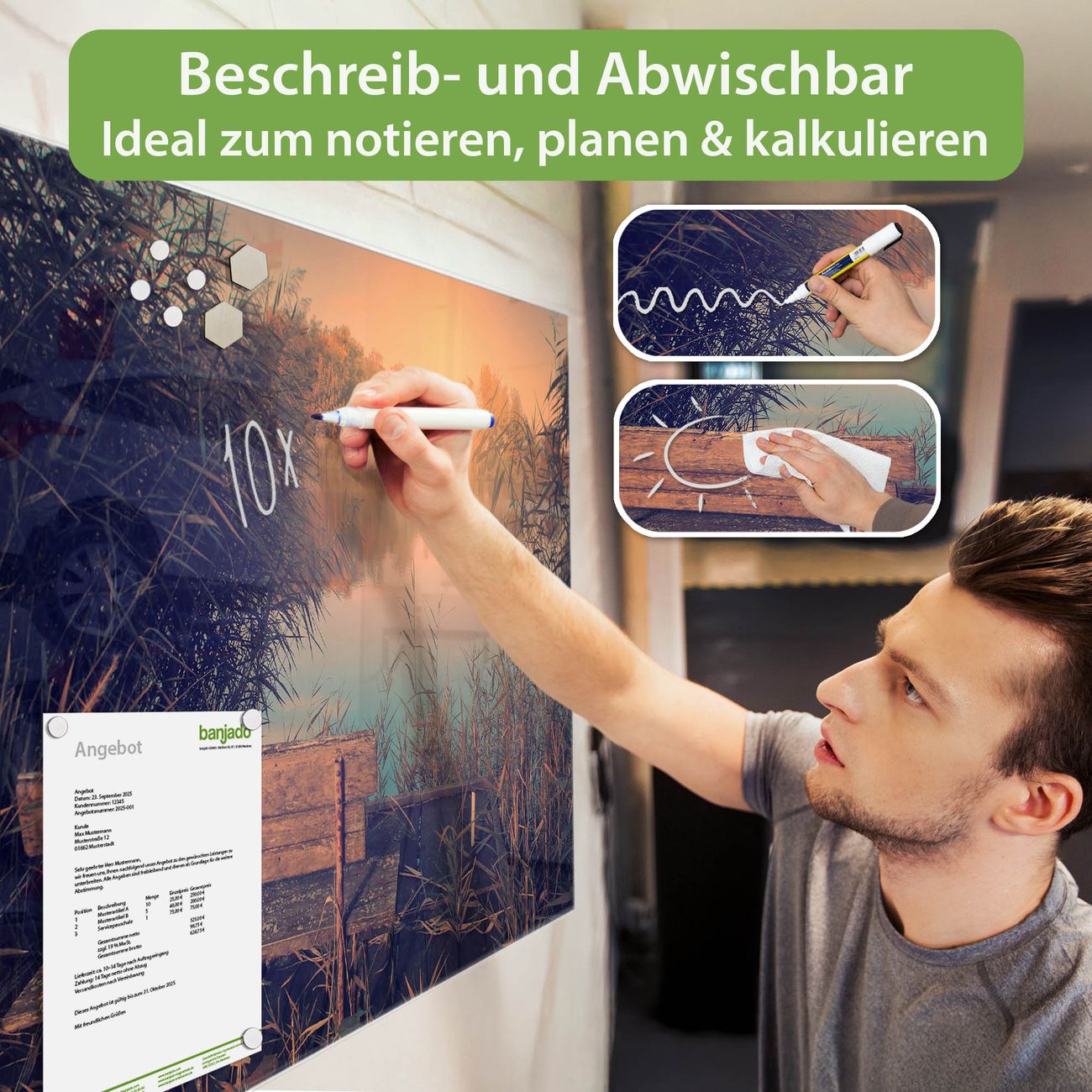 Jede Glas Magnettafel wird in unserer Werkstatt von Hand gefertigt und sorgfältig geprüft. So erhalten Sie ein echtes Qualitätsprodukt, das Funktion und Ästhetik perfekt vereint.?? Warum banjado?