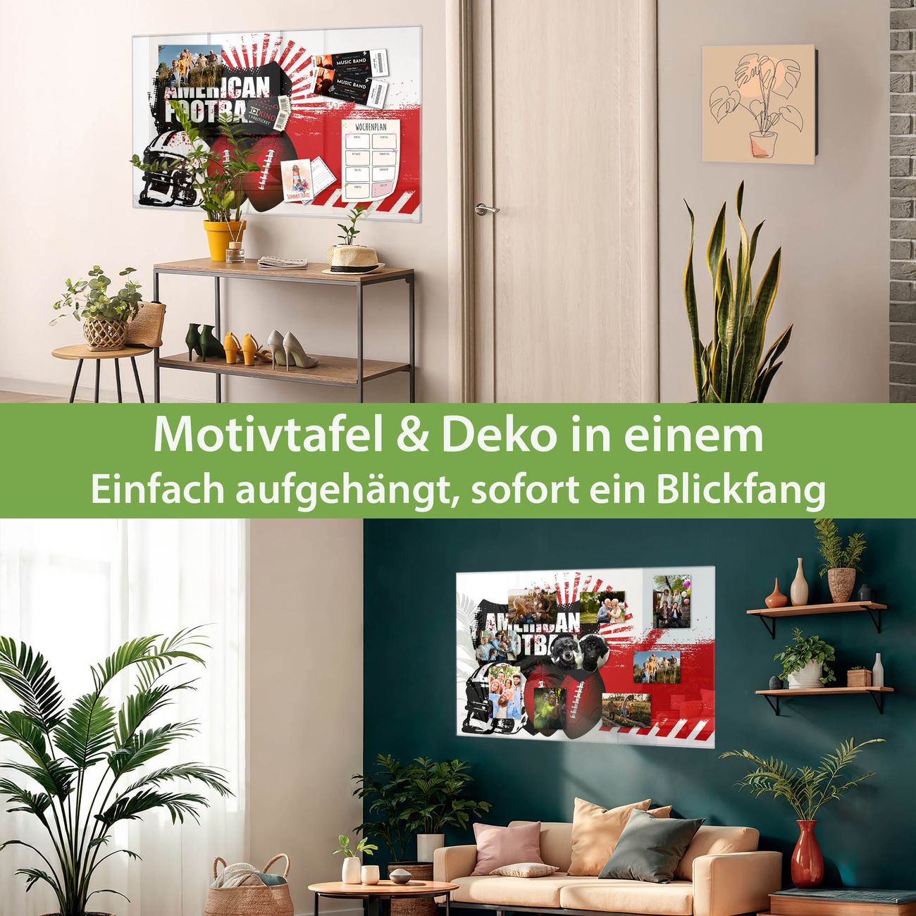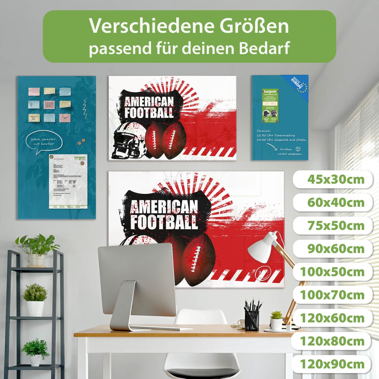 Die banjado Glas Magnettafel mit dem Motiv Motiv American Football verbindet Funktionalität mit Stil. Sie ersetzt das Zettelchaos durch klare Strukturen und bringt dabei eine warme, natürliche Atmosphäre in Ihr Zuhause. Ob im Büro, in der Küche oder im Eingangsbereich - dieses Design-Board zieht Blicke an und sorgt für Ordnung mit Charakter.