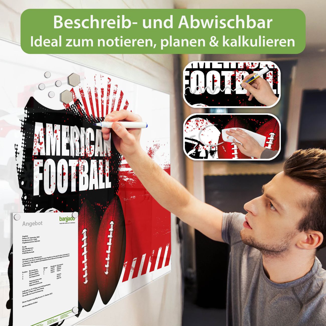 Ein Stück Design, das Ihren Alltag organisiert. Schreiben, heften, inspirieren - alles an einem Ort. Qualität, die man spürt. Montage leicht gemacht. Handwerk mit Herz - veredelt in Sachsen. Einzigartiges Design mit Motiv Motiv American Football Beschreibbare Glasoberfläche, leicht zu reinigen Starke Magnetkraft durch Stahlrückwand Inklusive 4 Neodym-Magneten Flexible Montageoptionen Handveredelt in Sachsen - Qualität, die bleibt