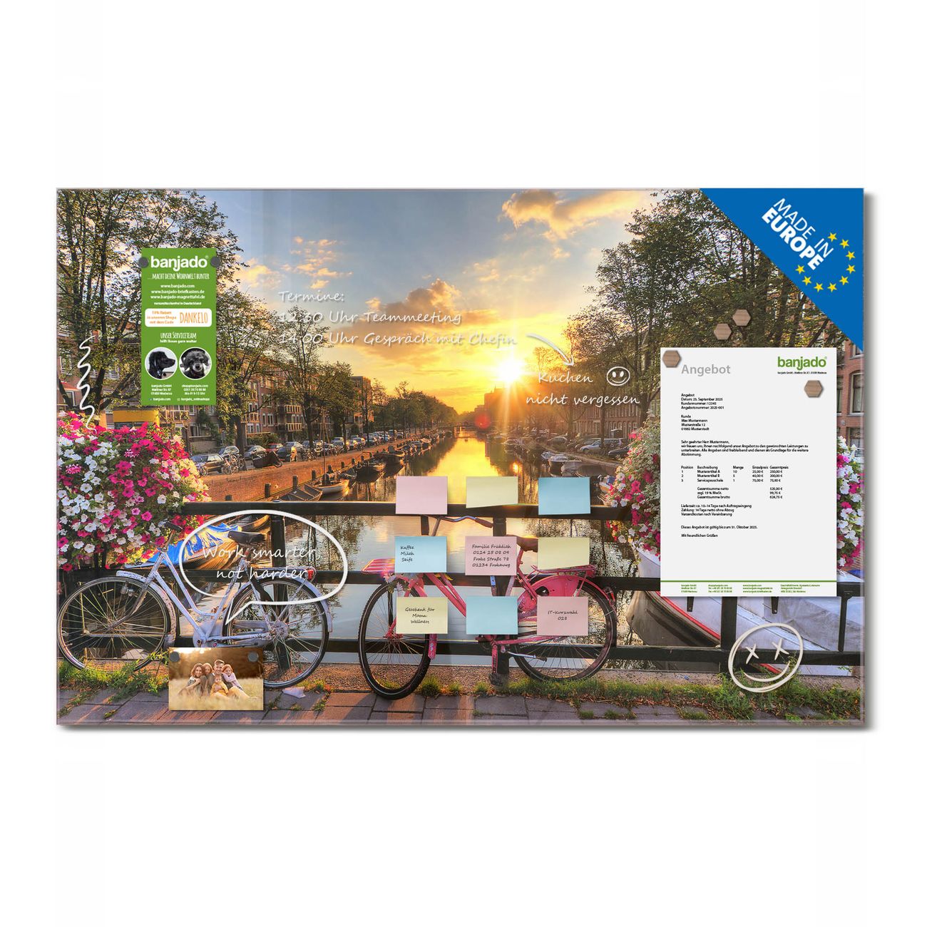 Jede Glas Magnettafel wird in unserer Werkstatt von Hand gefertigt und sorgfältig geprüft. So erhalten Sie ein echtes Qualitätsprodukt, das Funktion und Ästhetik perfekt vereint.?? Warum banjado?