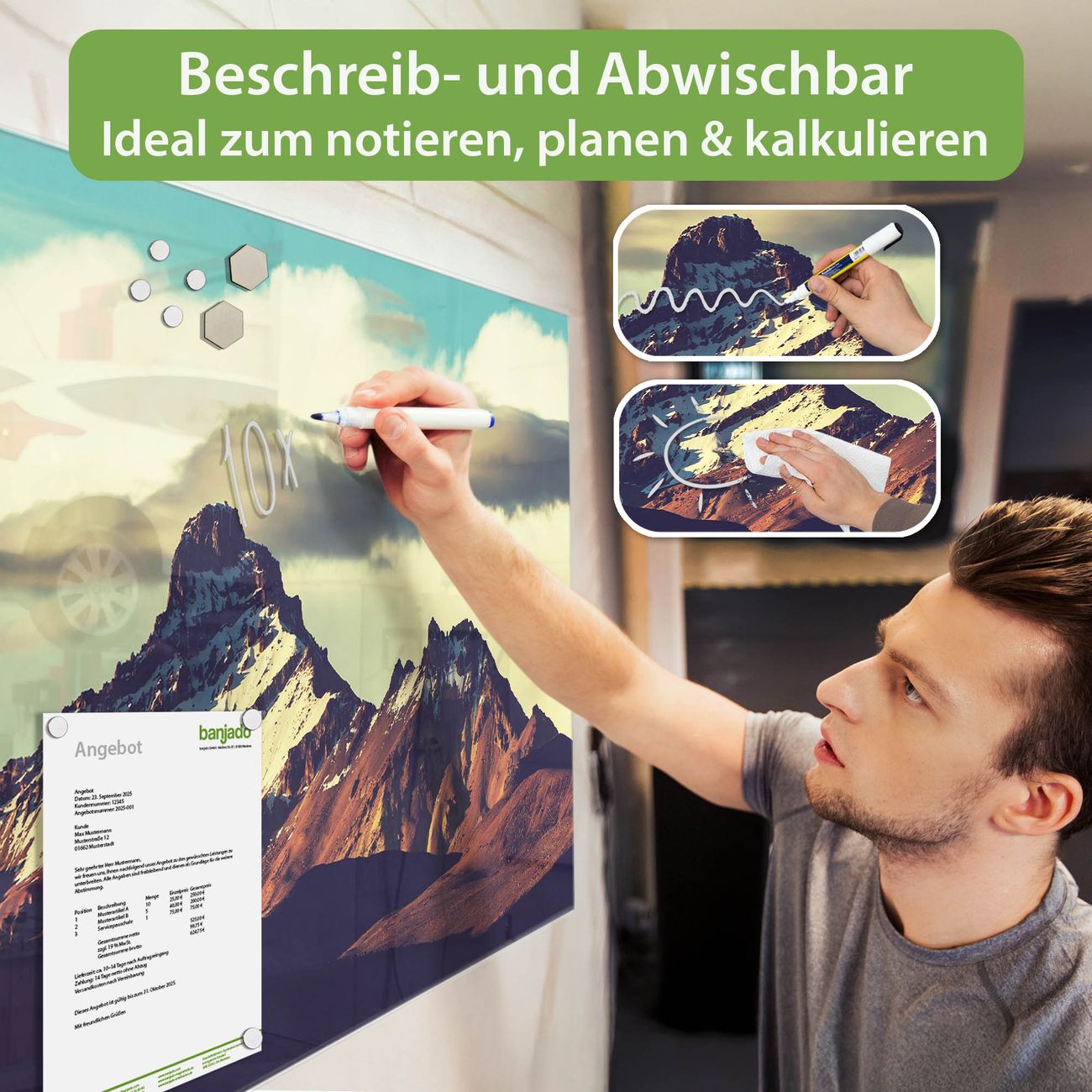 Jede Glas Magnettafel wird in unserer Werkstatt von Hand gefertigt und sorgfältig geprüft. So erhalten Sie ein echtes Qualitätsprodukt, das Funktion und Ästhetik perfekt vereint.?? Warum banjado?