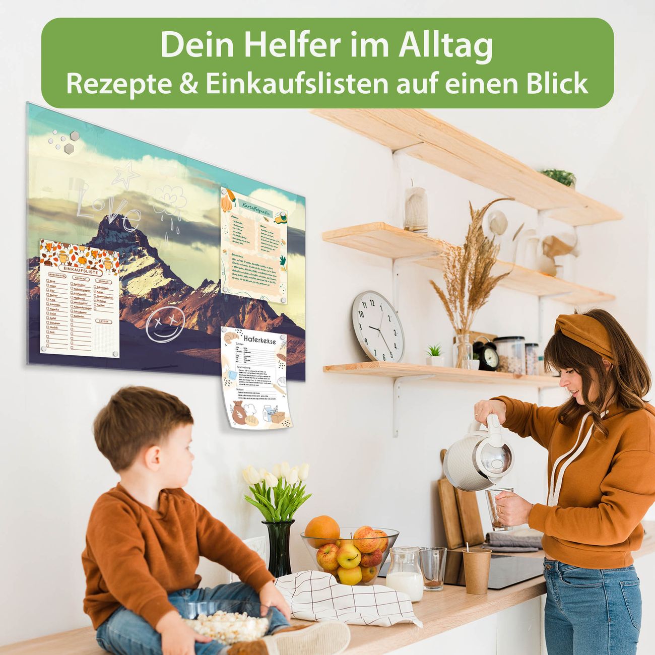 Auf der glatten Glasoberfläche lassen sich Termine, Rezepte oder Notizen ganz einfach mit Kreidestiften festhalten und rückstandslos entfernen. Starke Neodym-Magnete halten Ihre wichtigsten Erinnerungen sicher an Ort und Stelle. So entsteht Ihre ganz persönliche Ideenwand - jeden Tag neu.