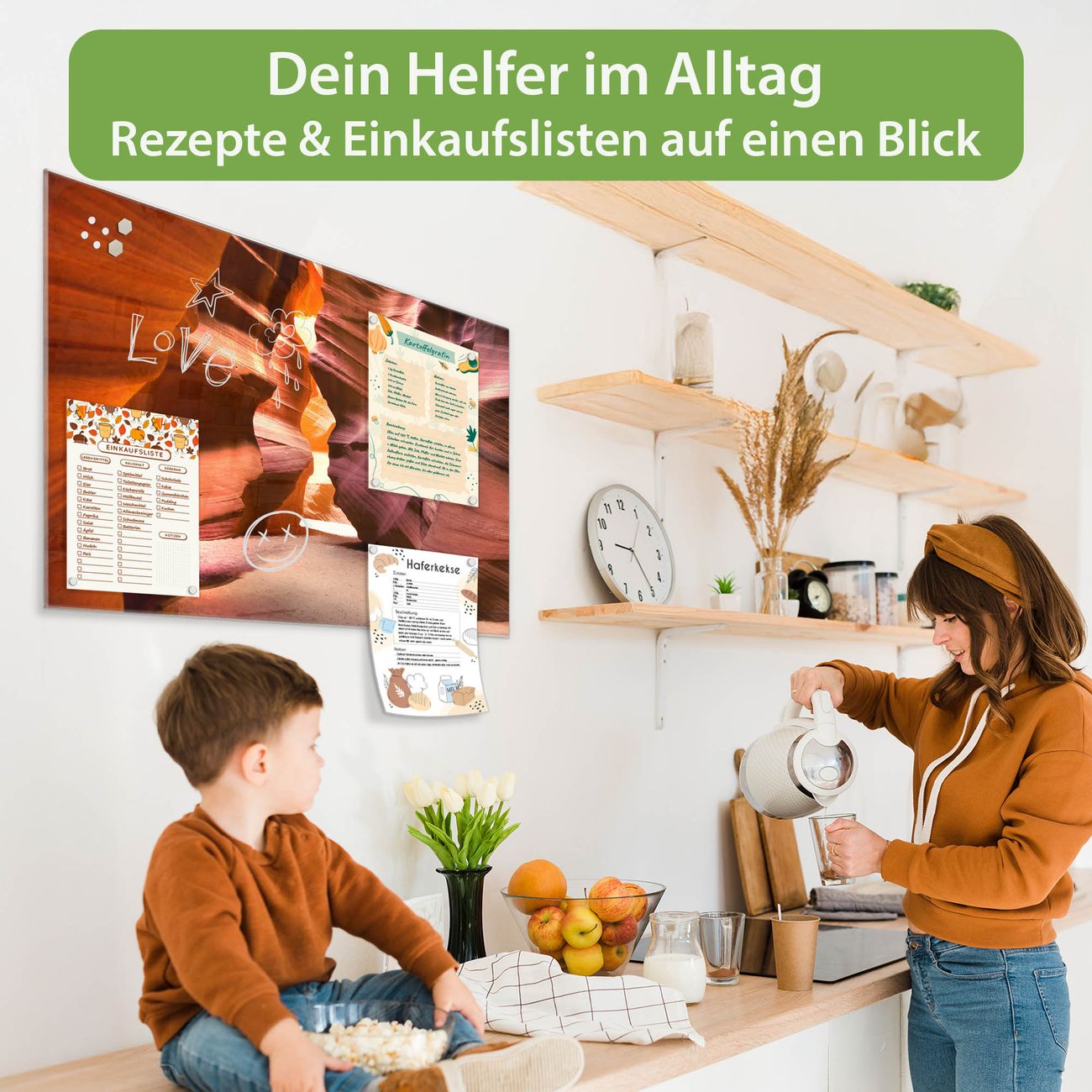 Ein Stück Design, das Ihren Alltag organisiert. Schreiben, heften, inspirieren - alles an einem Ort. Qualität, die man spürt. Montage leicht gemacht. Handwerk mit Herz - veredelt in Sachsen. Einzigartiges Design mit Motiv Motiv Antelope Canyon Beschreibbare Glasoberfläche, leicht zu reinigen Starke Magnetkraft durch Stahlrückwand Inklusive 4 Neodym-Magneten Flexible Montageoptionen Handveredelt in Sachsen - Qualität, die bleibt
