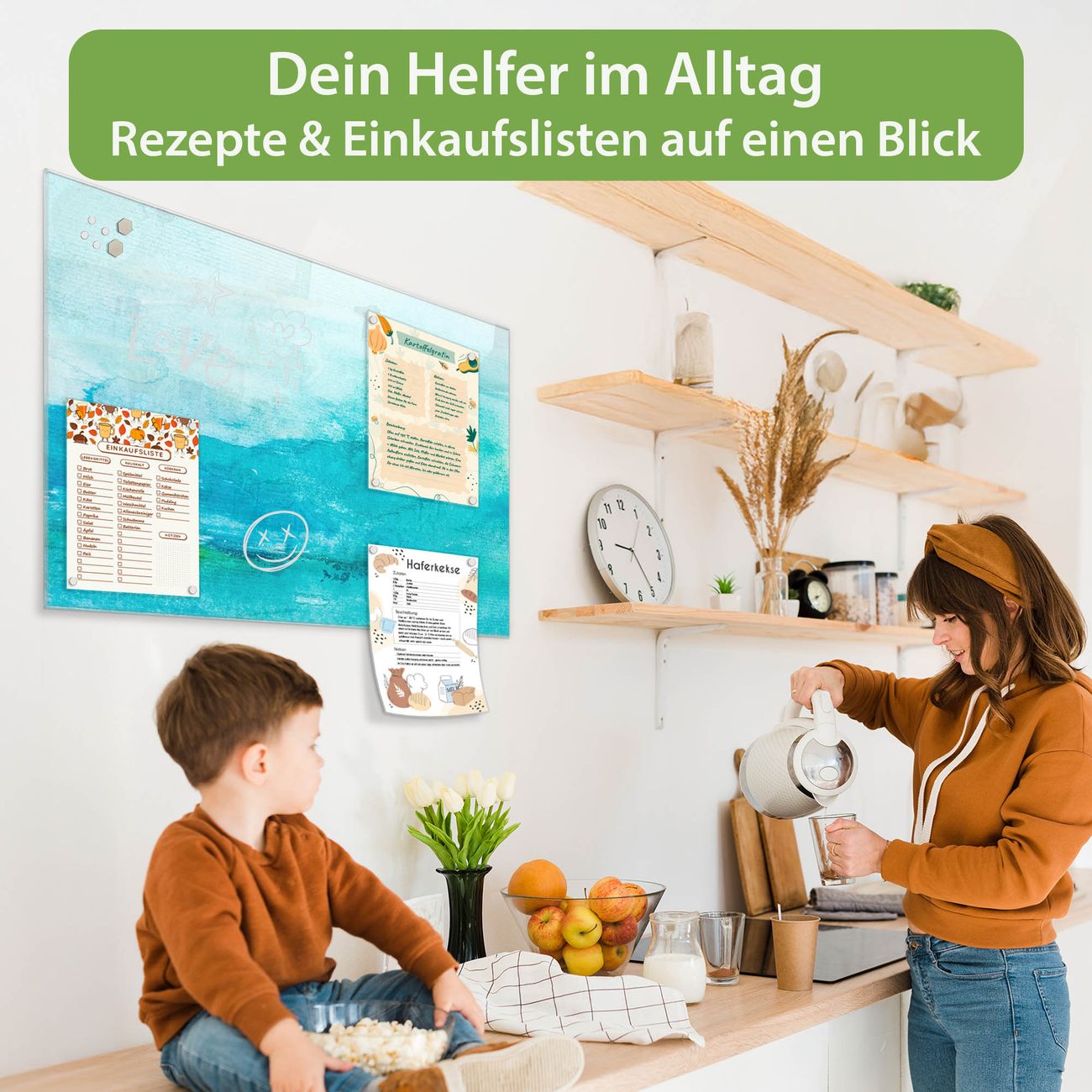Auf der glatten Glasoberfläche lassen sich Termine, Rezepte oder Notizen ganz einfach mit Kreidestiften festhalten und rückstandslos entfernen. Starke Neodym-Magnete halten Ihre wichtigsten Erinnerungen sicher an Ort und Stelle. So entsteht Ihre ganz persönliche Ideenwand - jeden Tag neu.
