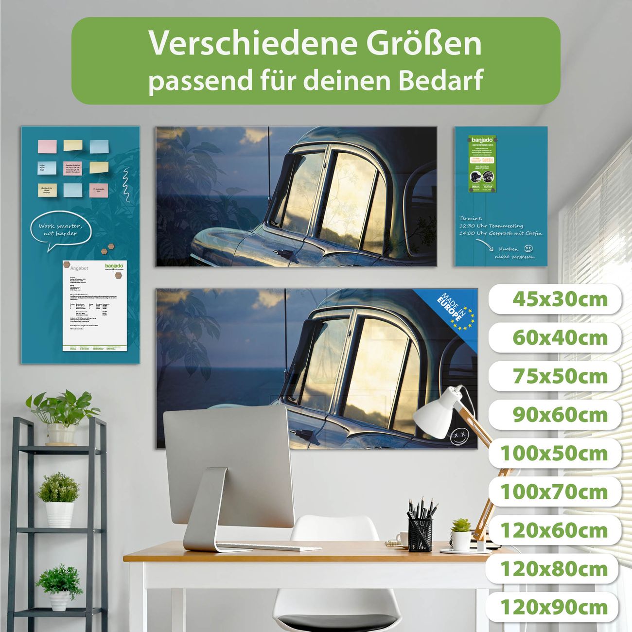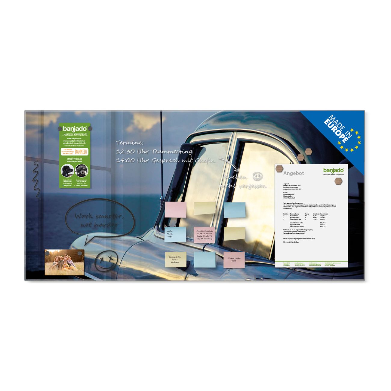 Jede Glas Magnettafel wird in unserer Werkstatt von Hand gefertigt und sorgfältig geprüft. So erhalten Sie ein echtes Qualitätsprodukt, das Funktion und Ästhetik perfekt vereint.?? Warum banjado?
