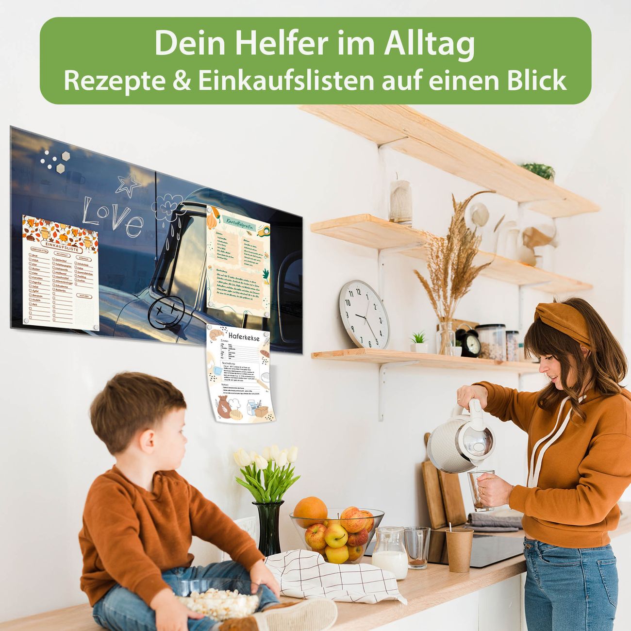 Auf der glatten Glasoberfläche lassen sich Termine, Rezepte oder Notizen ganz einfach mit Kreidestiften festhalten und rückstandslos entfernen. Starke Neodym-Magnete halten Ihre wichtigsten Erinnerungen sicher an Ort und Stelle. So entsteht Ihre ganz persönliche Ideenwand - jeden Tag neu.