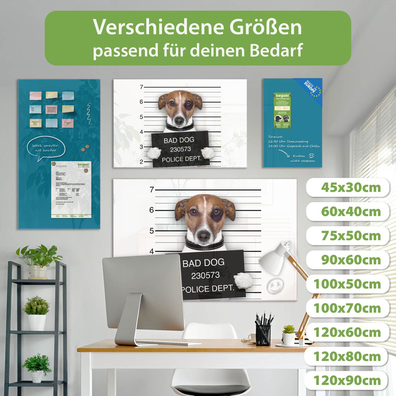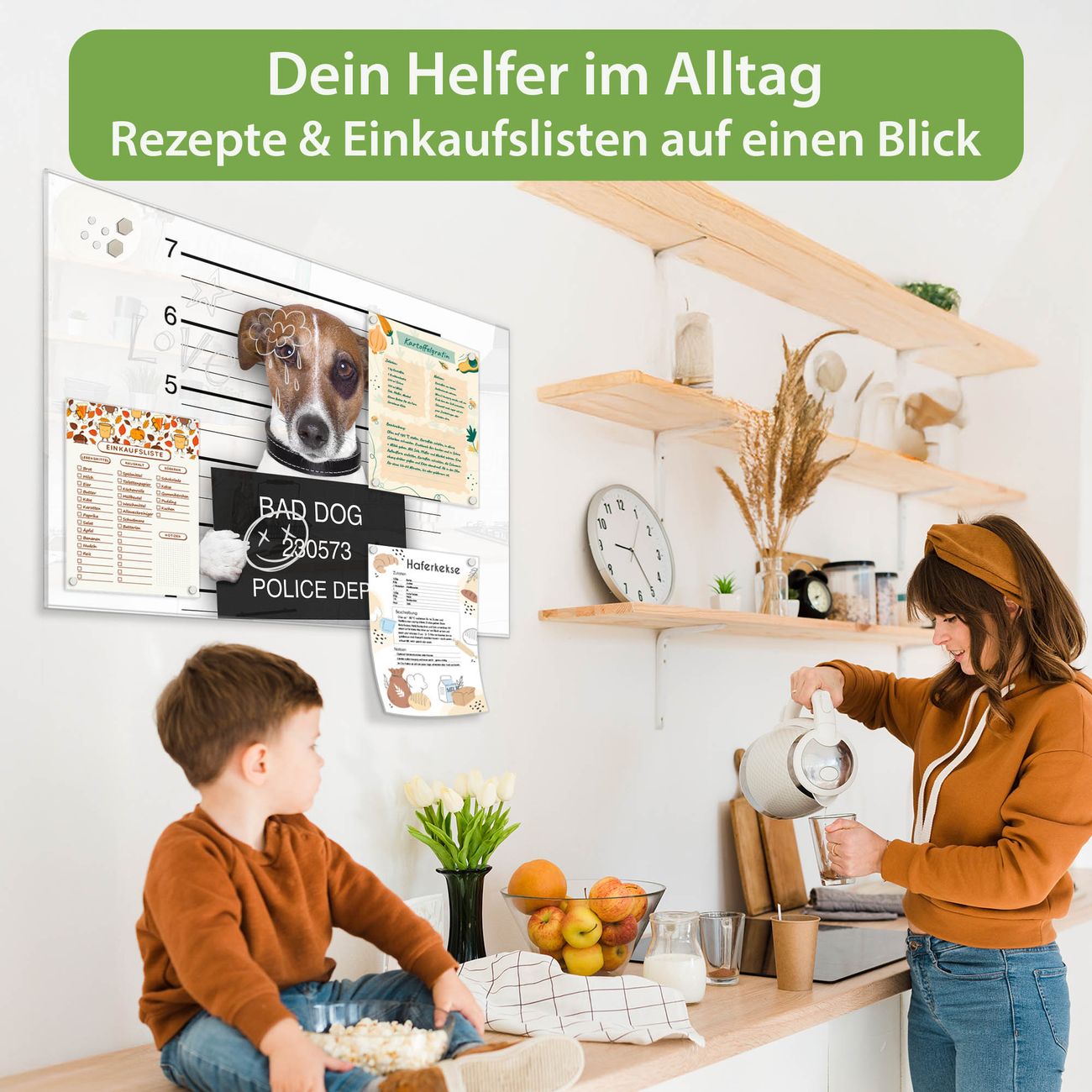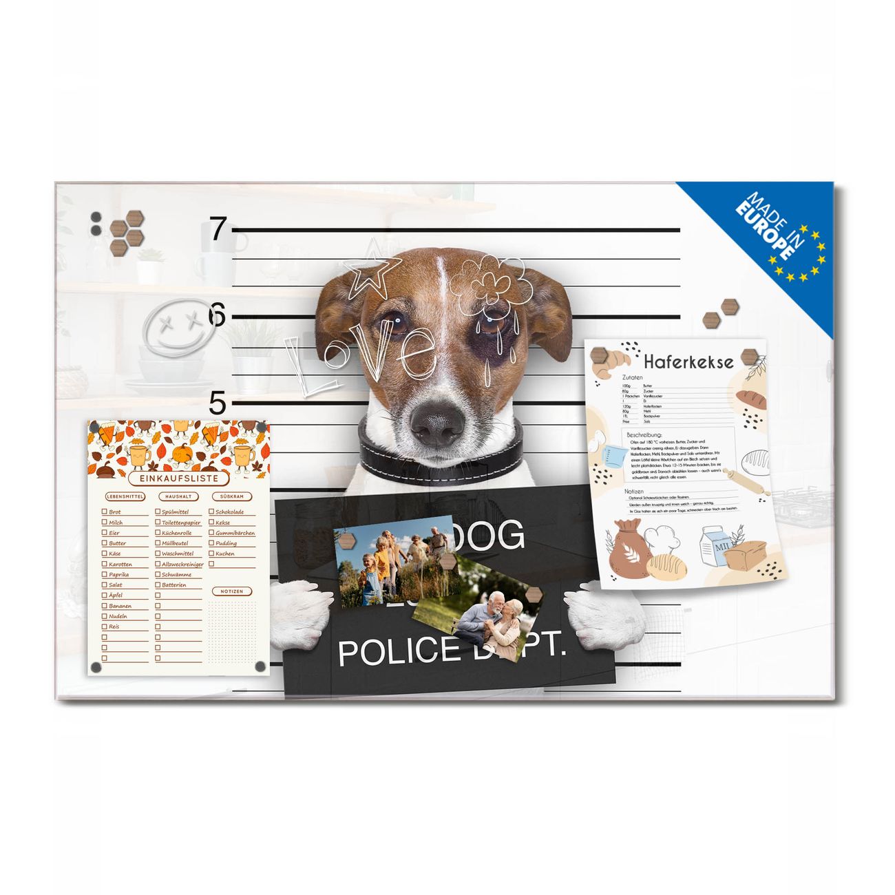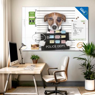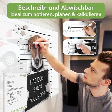 Ein Stück Design, das Ihren Alltag organisiert. Schreiben, heften, inspirieren - alles an einem Ort. Qualität, die man spürt. Montage leicht gemacht. Handwerk mit Herz - veredelt in Sachsen. Einzigartiges Design mit Motiv Motiv Bad Dog Jack Russel Beschreibbare Glasoberfläche, leicht zu reinigen Starke Magnetkraft durch Stahlrückwand Inklusive 4 Neodym-Magneten Flexible Montageoptionen Handveredelt in Sachsen - Qualität, die bleibt