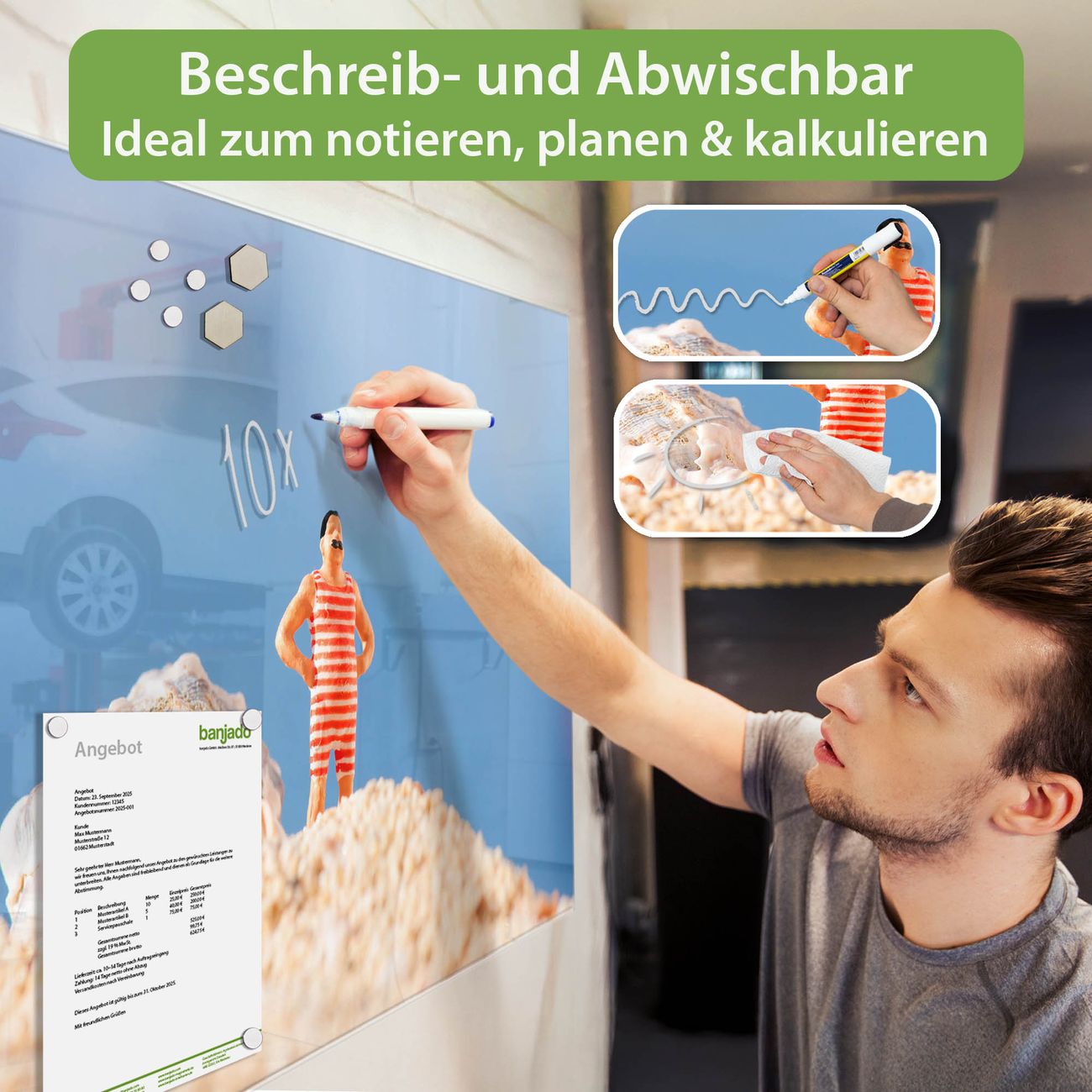 Bitte beachten Sie, dass ausschliessliche spezielle Magnete an der Glastafel haften. Wir empfehlen banjado Neodym Magnete, diese sind durch uns auf Wirksamkeit geprüft.