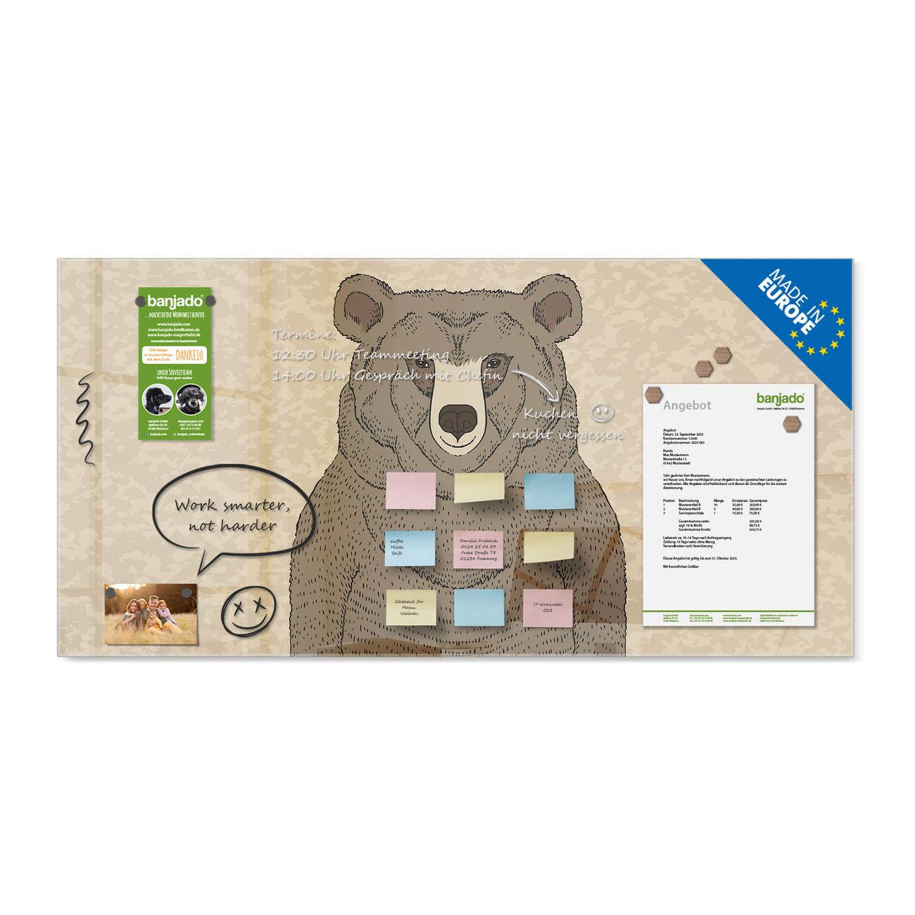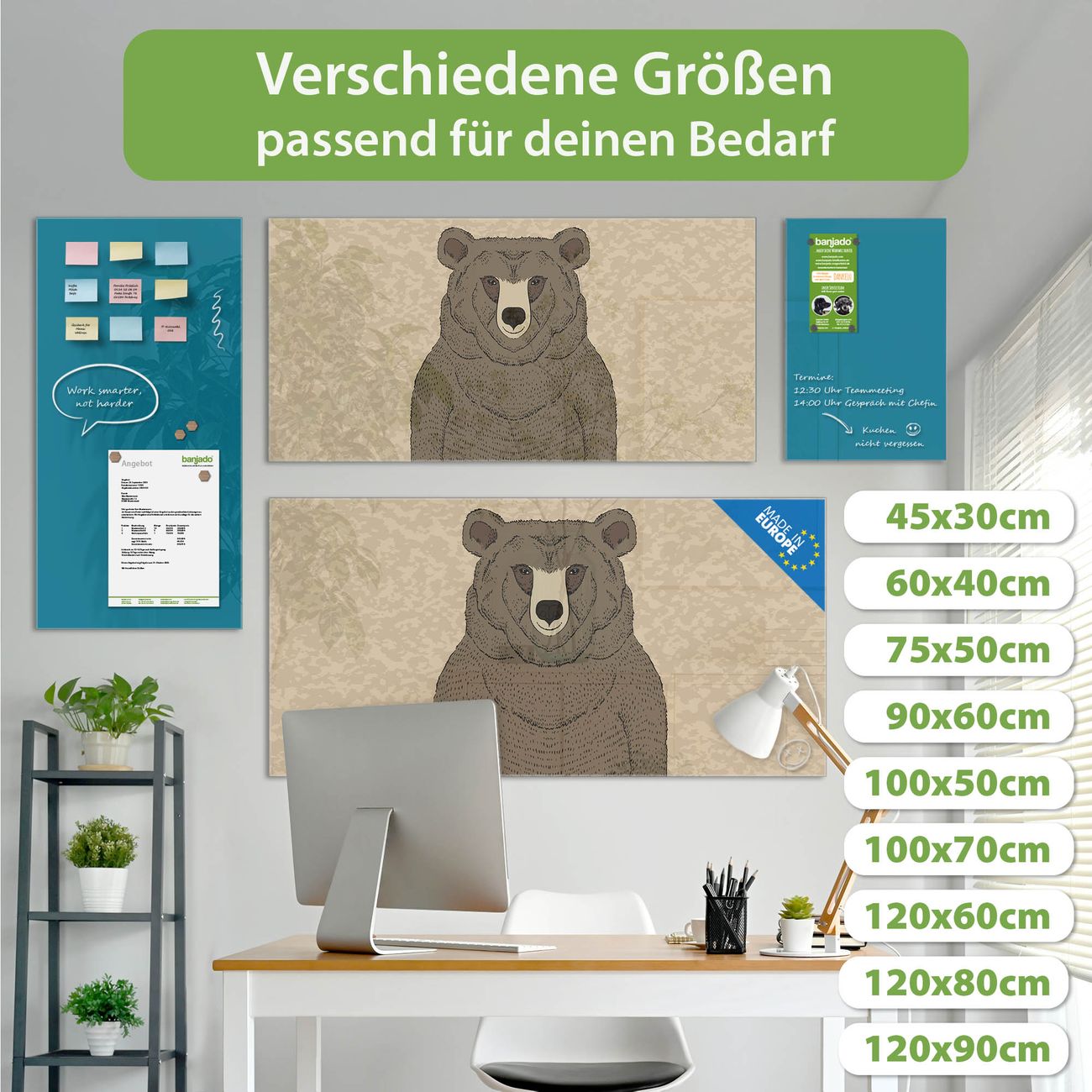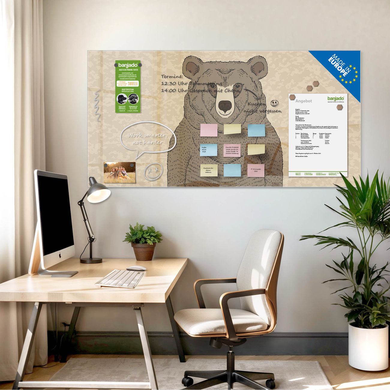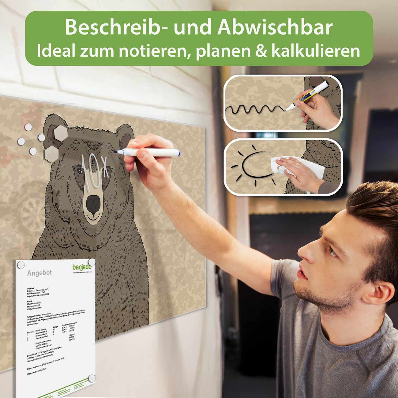 Jede Glas Magnettafel wird in unserer Werkstatt von Hand gefertigt und sorgfältig geprüft. So erhalten Sie ein echtes Qualitätsprodukt, das Funktion und Ästhetik perfekt vereint.?? Warum banjado?