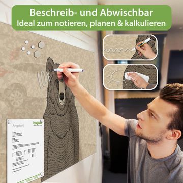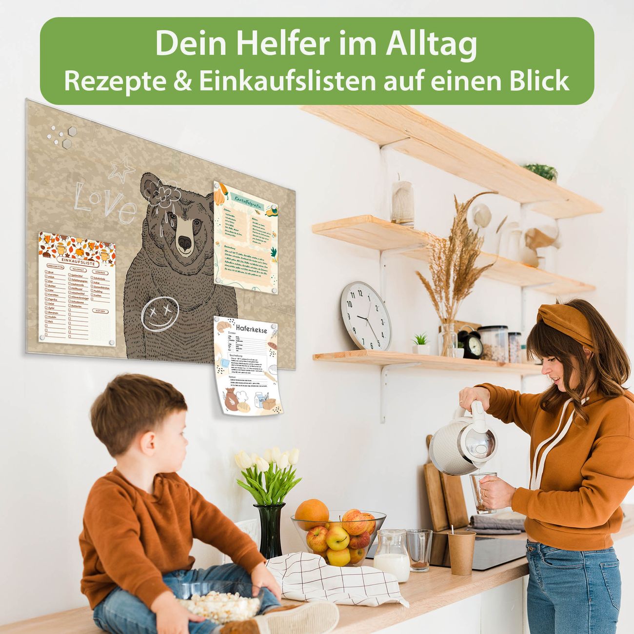 Ein Stück Design, das Ihren Alltag organisiert. Schreiben, heften, inspirieren - alles an einem Ort. Qualität, die man spürt. Montage leicht gemacht. Handwerk mit Herz - veredelt in Sachsen. Einzigartiges Design mit Motiv Motiv Bär Ohne Brille Beschreibbare Glasoberfläche, leicht zu reinigen Starke Magnetkraft durch Stahlrückwand Inklusive 4 Neodym-Magneten Flexible Montageoptionen Handveredelt in Sachsen - Qualität, die bleibt