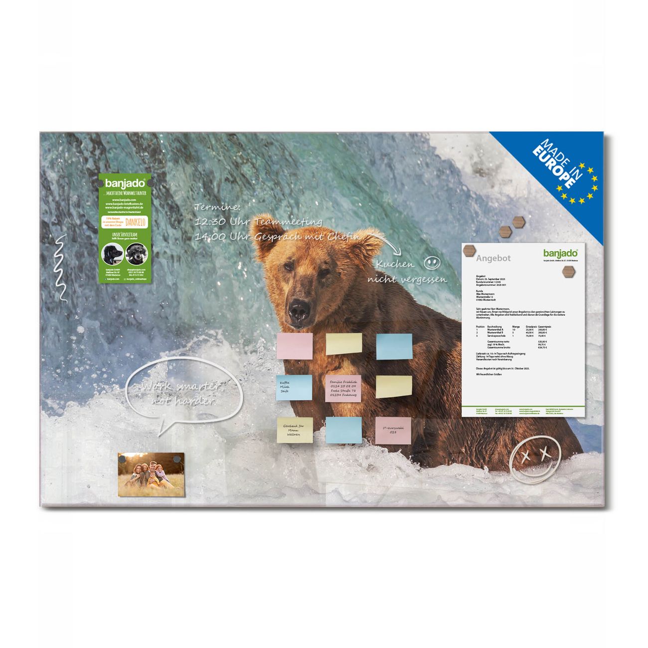 Jede Glas Magnettafel wird in unserer Werkstatt von Hand gefertigt und sorgfältig geprüft. So erhalten Sie ein echtes Qualitätsprodukt, das Funktion und Ästhetik perfekt vereint.?? Warum banjado?