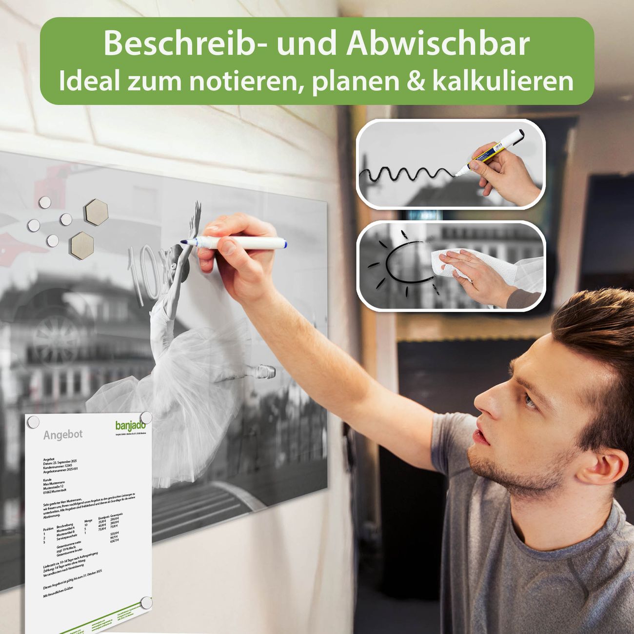 Jede Glas Magnettafel wird in unserer Werkstatt von Hand gefertigt und sorgfältig geprüft. So erhalten Sie ein echtes Qualitätsprodukt, das Funktion und Ästhetik perfekt vereint.?? Warum banjado?