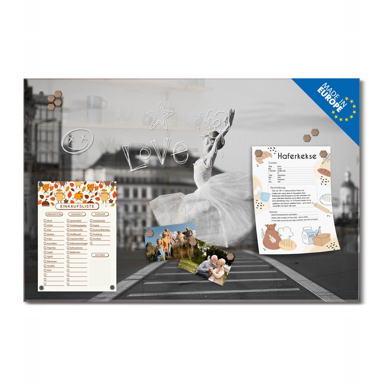 Ein Stück Design, das Ihren Alltag organisiert. Schreiben, heften, inspirieren - alles an einem Ort. Qualität, die man spürt. Montage leicht gemacht. Handwerk mit Herz - veredelt in Sachsen. Einzigartiges Design mit Motiv Motiv Ballerina In Moskau Beschreibbare Glasoberfläche, leicht zu reinigen Starke Magnetkraft durch Stahlrückwand Inklusive 4 Neodym-Magneten Flexible Montageoptionen Handveredelt in Sachsen - Qualität, die bleibt