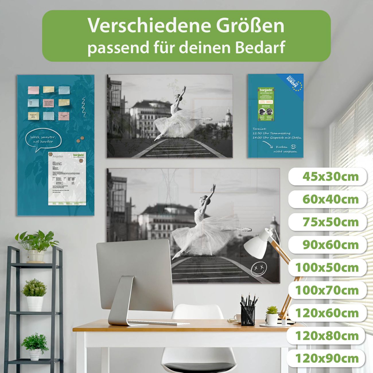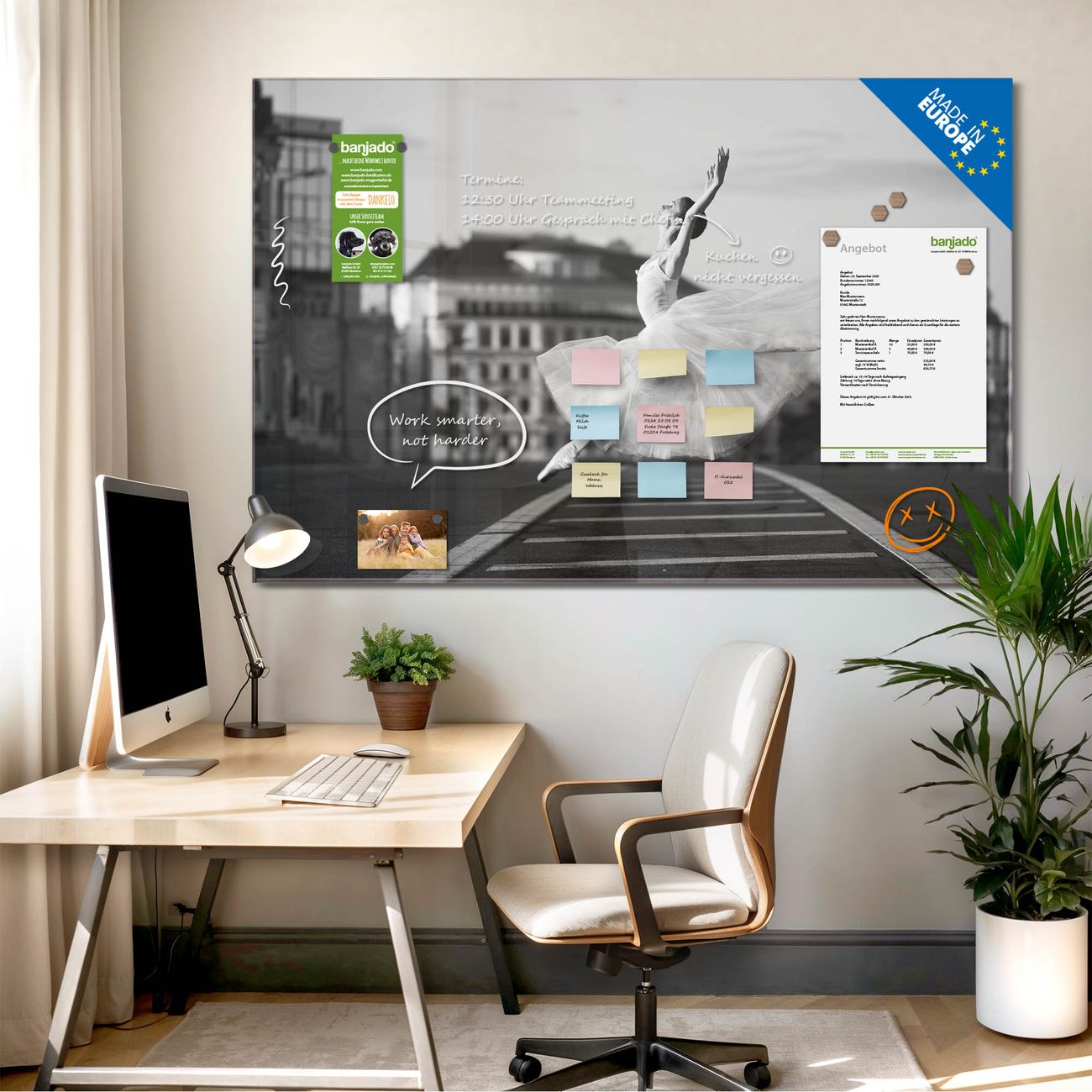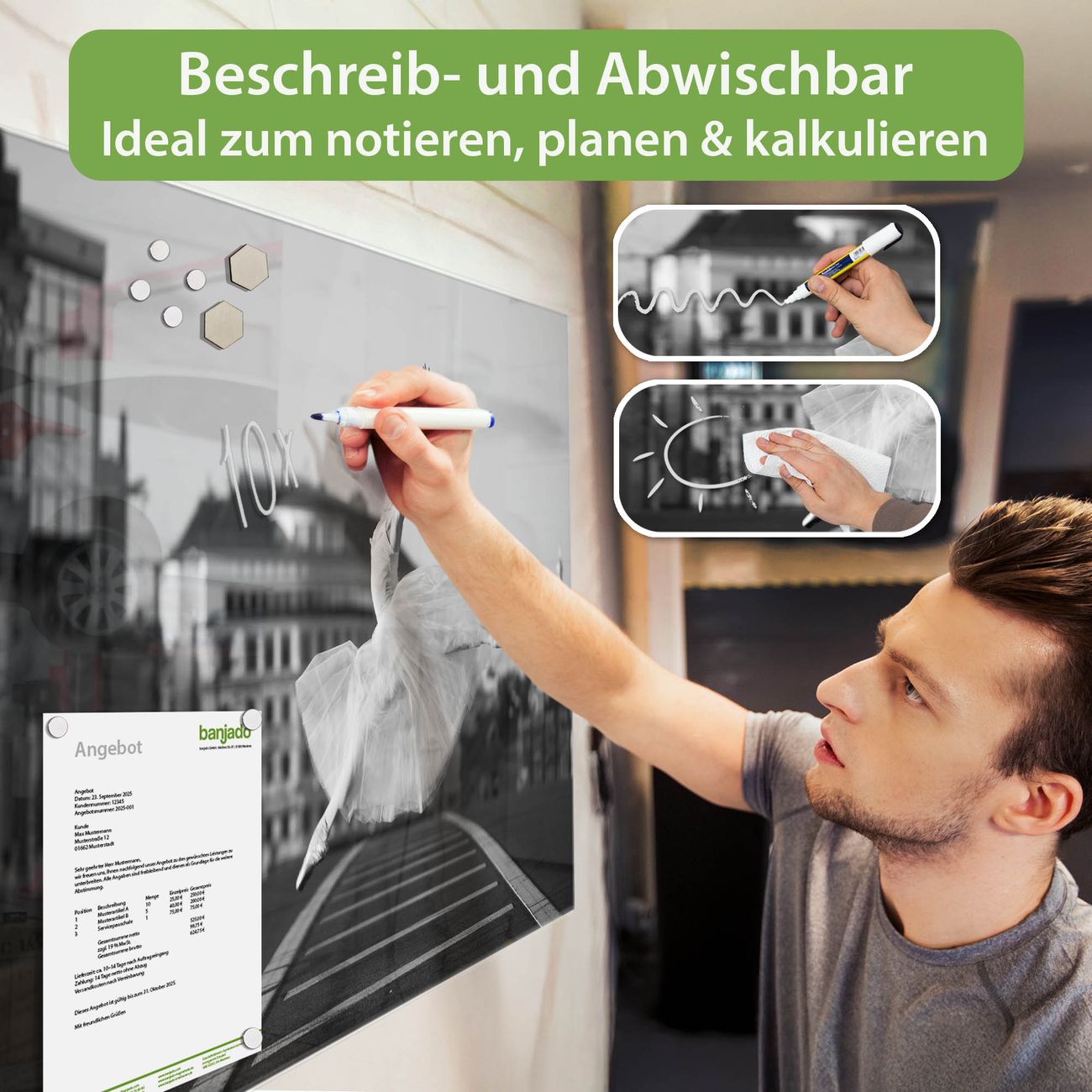 Jede Glas Magnettafel wird in unserer Werkstatt von Hand gefertigt und sorgfältig geprüft. So erhalten Sie ein echtes Qualitätsprodukt, das Funktion und Ästhetik perfekt vereint.?? Warum banjado?