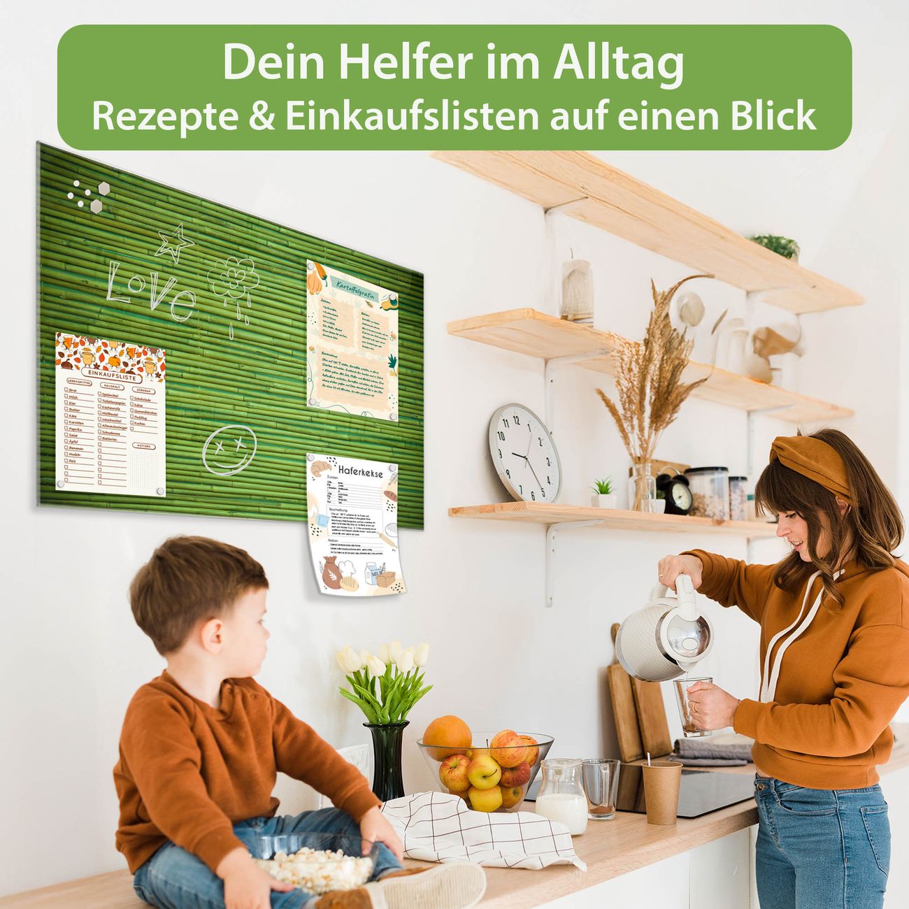 Ein Stück Design, das Ihren Alltag organisiert. Schreiben, heften, inspirieren - alles an einem Ort. Qualität, die man spürt. Montage leicht gemacht. Handwerk mit Herz - veredelt in Sachsen. Einzigartiges Design mit Motiv Motiv Bambus Grün Beschreibbare Glasoberfläche, leicht zu reinigen Starke Magnetkraft durch Stahlrückwand Inklusive 4 Neodym-Magneten Flexible Montageoptionen Handveredelt in Sachsen - Qualität, die bleibt