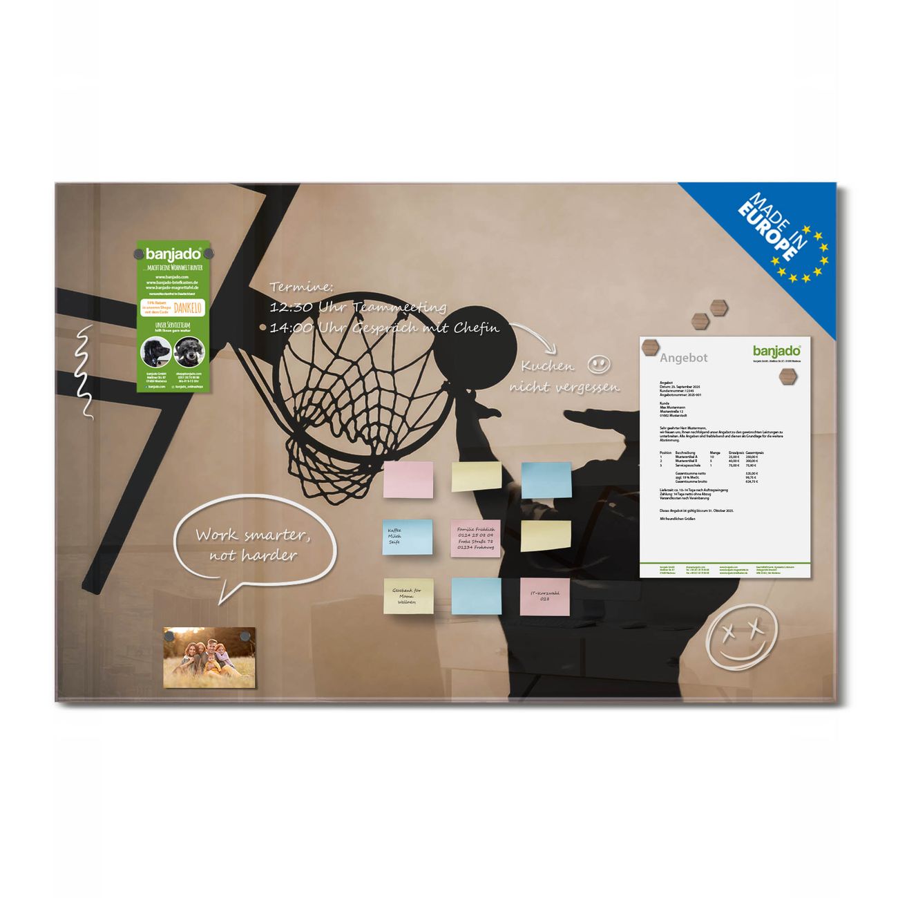 Jede Glas Magnettafel wird in unserer Werkstatt von Hand gefertigt und sorgfältig geprüft. So erhalten Sie ein echtes Qualitätsprodukt, das Funktion und Ästhetik perfekt vereint.?? Warum banjado?