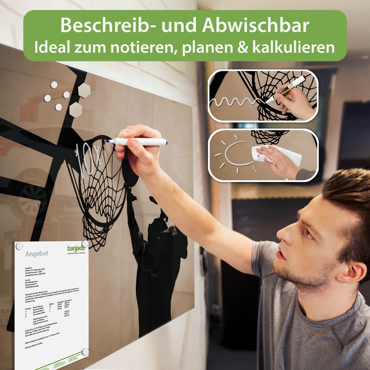 Bitte beachten Sie, dass ausschliessliche spezielle Magnete an der Glastafel haften. Wir empfehlen banjado Neodym Magnete, diese sind durch uns auf Wirksamkeit geprüft.