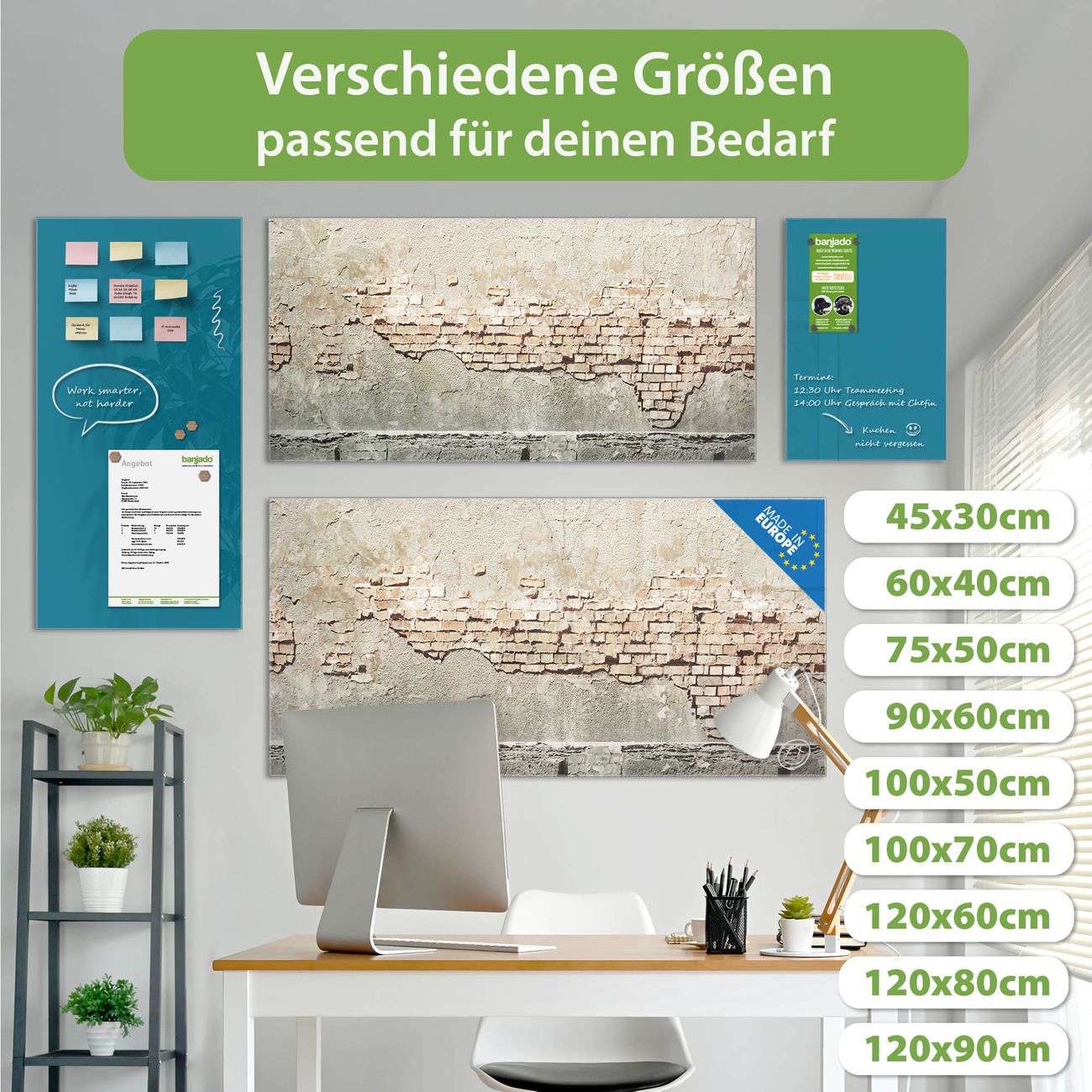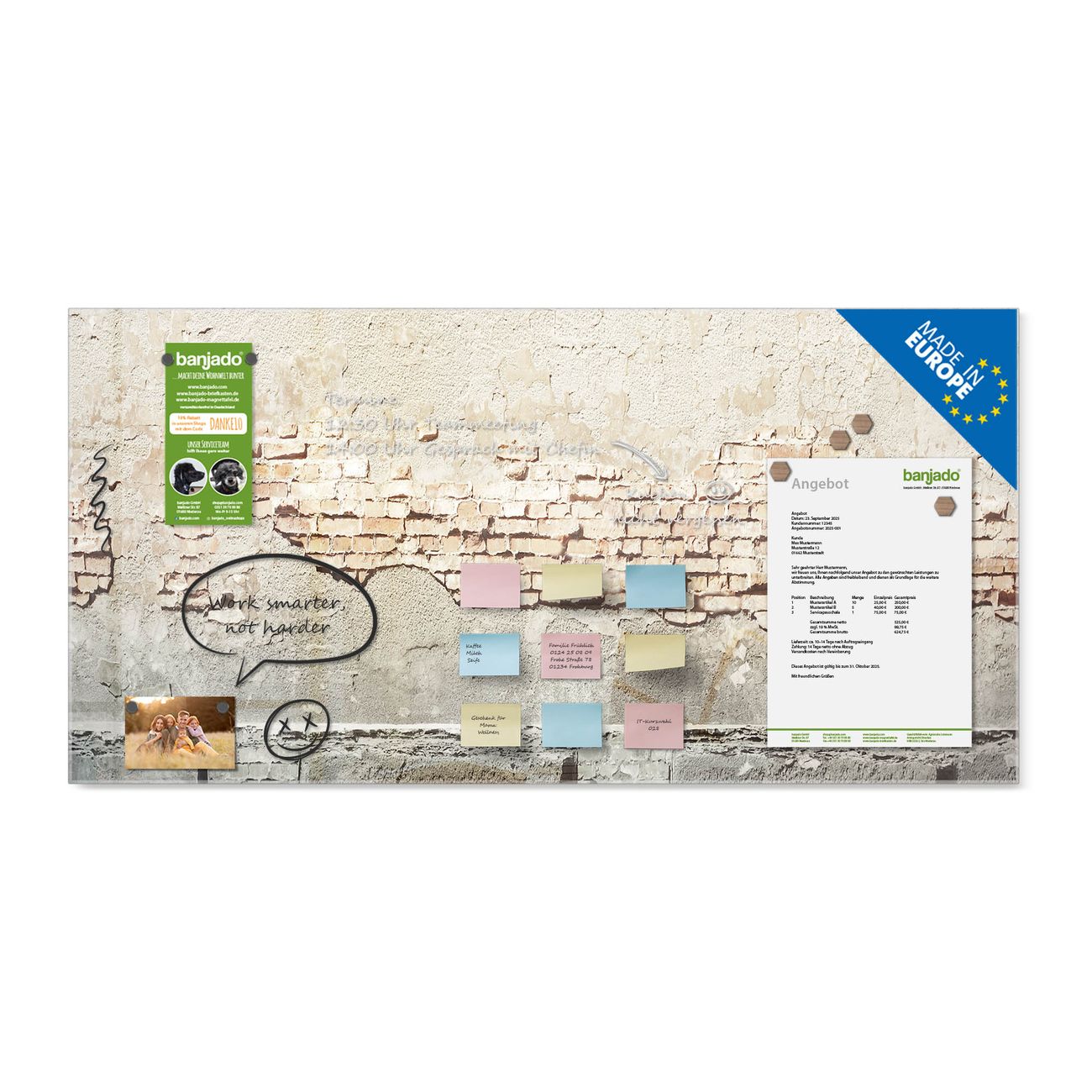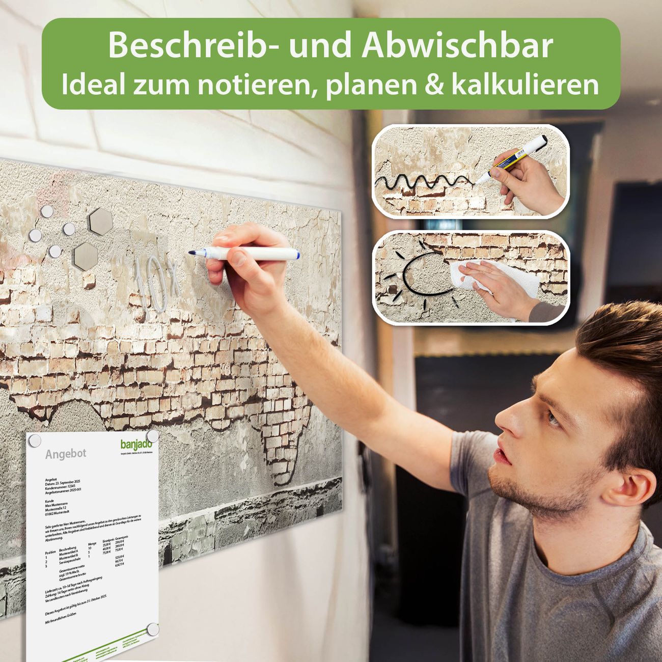 Jede Glas Magnettafel wird in unserer Werkstatt von Hand gefertigt und sorgfältig geprüft. So erhalten Sie ein echtes Qualitätsprodukt, das Funktion und Ästhetik perfekt vereint.?? Warum banjado?